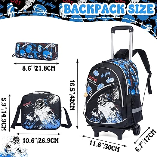 Multifuncional: este conjunto de 3 peças inclui uma mochila escolar com rodas que pode ser usada como mochila com rodas para crianças e também como mochila escolar convencional para crianças. O conjunto também inclui uma caixa para guardar utensílios de escrita e uma bolsa para refrigerantes, ideal para guardar o almoço e os refrigerantes.