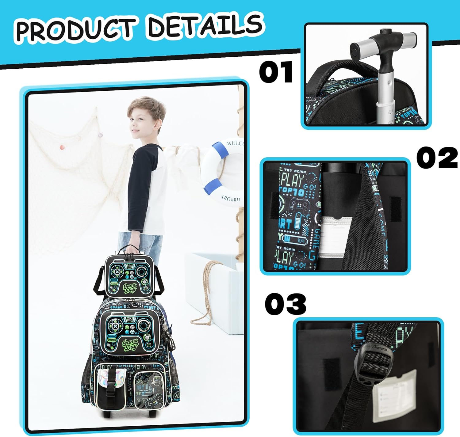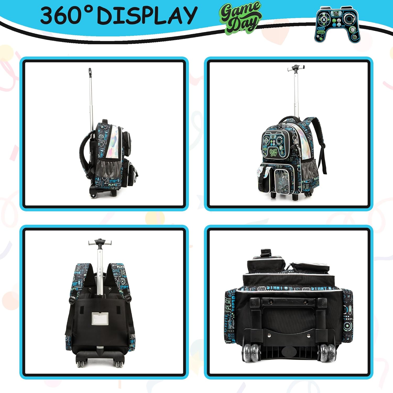 Tamanho: Mochila rodas criança: 43 cm x 30 cm x 20 cm, volume 24 litros; lancheira: 23 cm x 20 cm, volume 5 litros; estojo: 23 cm. Grande capacidade: mochilas escolares com rodas com grandes compartimentos e bolsos, esta mochila pode organizar livros, computadores, guarda-chuvas, garrafas de água, artigos de papelaria e muito mais. Material: o design de 2 rodas com um eixo de liga de alumínio de alta resistência não só garante que possa girar suavemente e sem desgaste, mas também o torna fácil e natural. Confortável: a mochila escolar infantil com rodas pode contribuir de forma mais eficaz para reduzir a pressão nas costas, tornando a coluna mais saudável e protegendo-a do peso. A barra do carro de alumínio tem 2 configurações de comprimento, durável e forte.