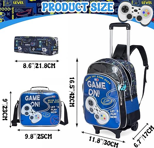 Dimensões: Mochila com rodas para crianças: 42 x 30 x 20 cm, lancheira de almoço: 23 x 20 cm, estojo para lápis: 23 cm.