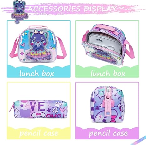 Mochila com rodas para menina: mochila com rodas para meninas: 42 x 30 x 20 cm, lancheira de 22 x 24 cm, estojo para lápis: 23 cm.