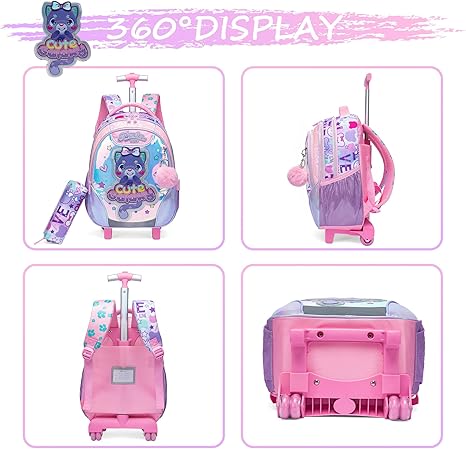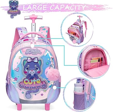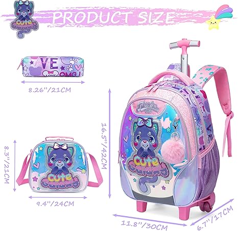 Capacidade: Mochilas escolares com rodas com 2 compartimentos, o bolso principal pode conter livros didáticos ou cadernos, 2 bolsos laterais de malha para garrafa de água ou guarda-chuva. 1 estojo para lápis e 1 lancheira ajustável.