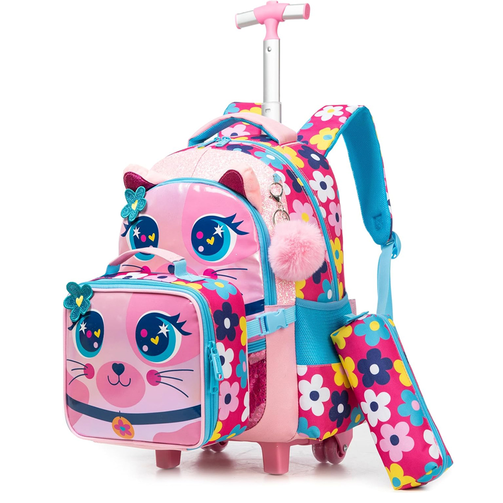 amanho: mochila rodas menina: 43 cm x 30 cm x 20 cm, lancheira de almoço: 23 cm x 20 cm, estojo para lápis: 23 cm. Design: Desenhamos uma variedade de gatos e gatinhos, unicórnios, raposas e pandas em cores brilhantes para que as crianças esperem com ilusão o novo curso escolar (tenha em conta que o trolley e a bolsa para livros não são removíveis). Trolley escolar de grande capacidade: as mochilas escolares com rodas têm um grande compartimento principal com um compartimento para computador, brinquedos, material escolar ou artigos de viagem, bem como bolsos frontais para ter à mão os objetos mais pequenos. Guarda-chuvas e garrafas de água podem ser guardadas nos bolsos de malha de ambos os lados. Confortável e prático. Material: O design de 2 rodas de baixo ruído com haste de liga de alumínio de alta resistência não só garante que pode ser girado sem problemas e resistente ao desgaste, mas também facilita e natural. A barra de alu de carrinho tem 2 configurações de comprimento, durável e forte.