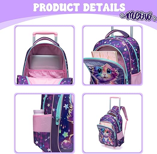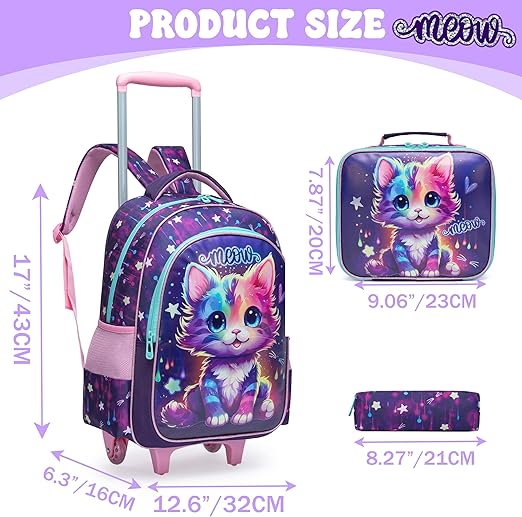 Dimensões: mochila rodas (vareta de carro não removível): 42 x 30 x 20 cm, lancheira: 23 x 20 cm, estojo: 23 cm. Conjunto: Esta mochila com rodas menina inclui uma mochila com rodas, um estojo para lápis e uma bolsa para lanche, ideal para almoço ou lanches entre as refeições. A mochila com rodas para meninas com uma relação preço-desempenho muito alta é o melhor presente para as crianças. Padrões: A mala com rodas para menina é decorada com padrões encantadores que encantarão todas as crianças. Os designs variam de gatos bonitos a emocionantes padrões de futebol e sirenes mágicas. Estes modelos são especialmente desenhados para crianças pequenas em idade escolar primária e fazem deste conjunto um autêntico ponto de atração.