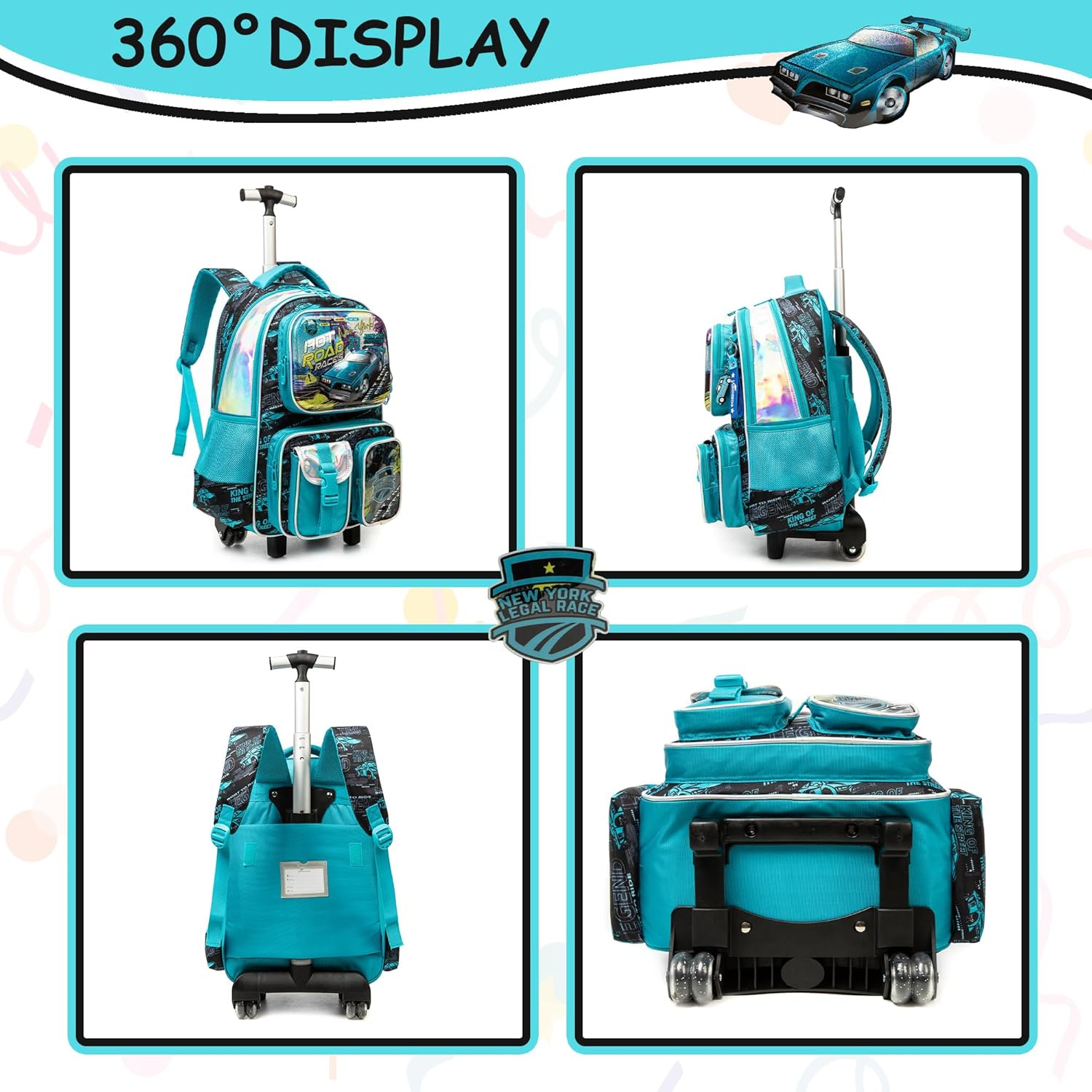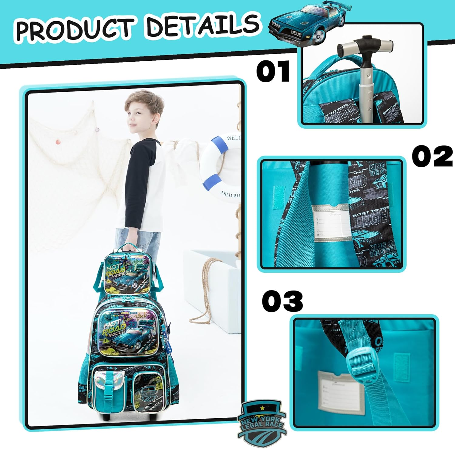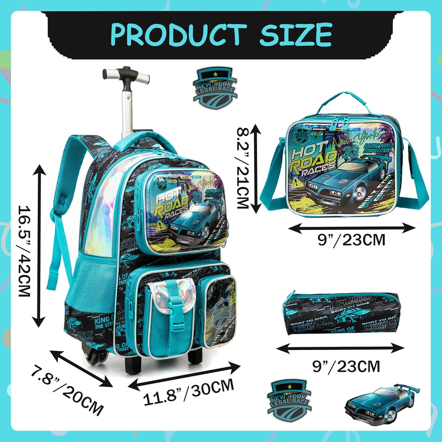 Tamanho: Mochila rodas criança: 43 cm x 30 cm x 20 cm, volume 24 litros; lancheira: 23 cm x 20 cm, volume 5 litros; estojo: 23 cm. Grande capacidade: mochilas escolares com rodas com grandes compartimentos e bolsos, esta mochila pode organizar livros, computadores, guarda-chuvas, garrafas de água, artigos de papelaria e muito mais. Material: o design de 2 rodas com um eixo de liga de alumínio de alta resistência não só garante que possa girar suavemente e sem desgaste, mas também o torna fácil e natural. Confortável: a mochila escolar infantil com rodas pode contribuir de forma mais eficaz para reduzir a pressão nas costas, tornando a coluna mais saudável e protegendo-a do peso. A barra do carro de alumínio tem 2 configurações de comprimento, durável e forte.