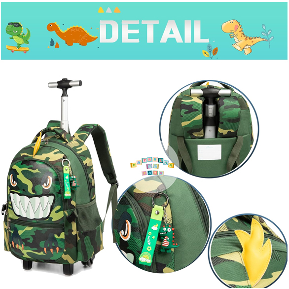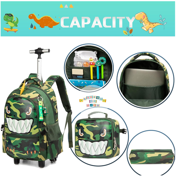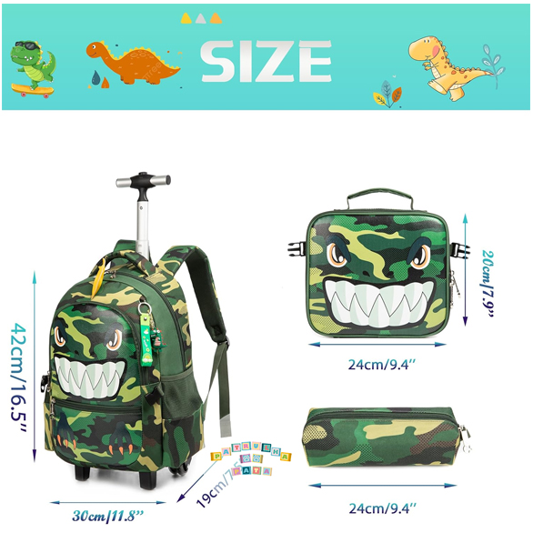 Tamanho: Mochila rodas criança: 42 cm x 30 cm x 20 cm, volume 24 litros; lancheira: 21 cm x 23 cm, volume 5 litros; estojo: 24 cm. Capacidade da mochila rolante para crianças: 1 compartimento principal grande com 1 bolso para laptop com 2 bolsos frontais com fecho; 2 bolsos de malha para garrafa Detalhes da mochila para crianças: design silencioso de 4 rodas com barra de liga de alumínio de alta resistência, não apenas garante que possa girá-la suavemente e antidesgaste corretamente, mas torna a roda fácil e natural. A barra e a bolsa não podem ser removidas.
