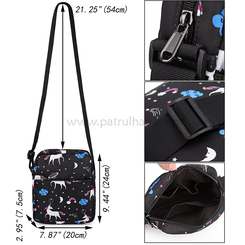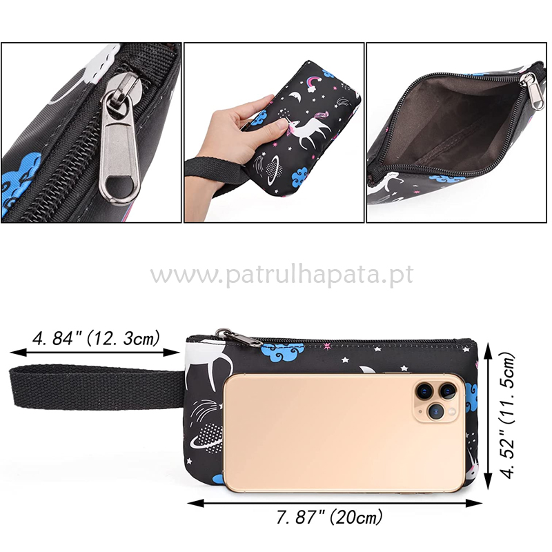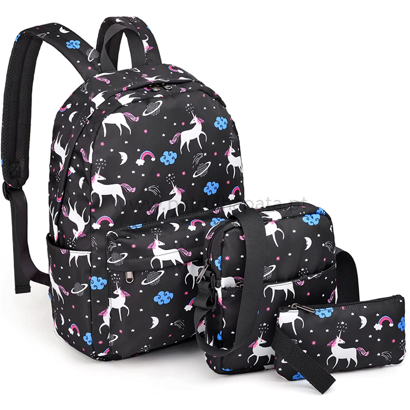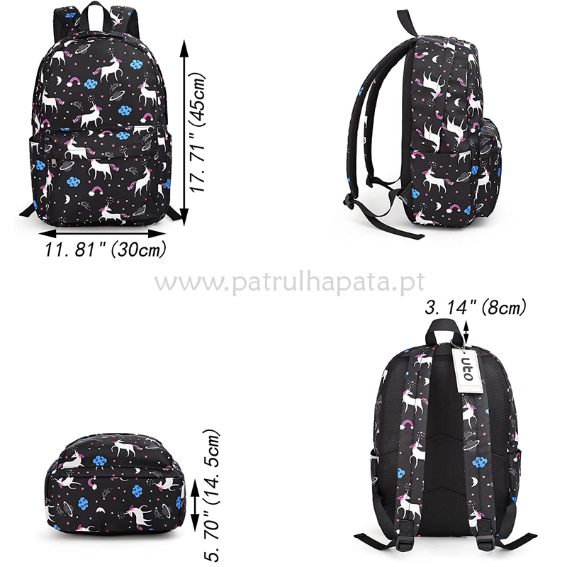 Fácil de organizar: 1 secção grande de fecho de correr, 1 bolsos frontais com fecho de correr, 2 bolsos laterais para garrafas de água. Também inclui uma bolsa de ombro e um estojo para lápis com fecho de correr.