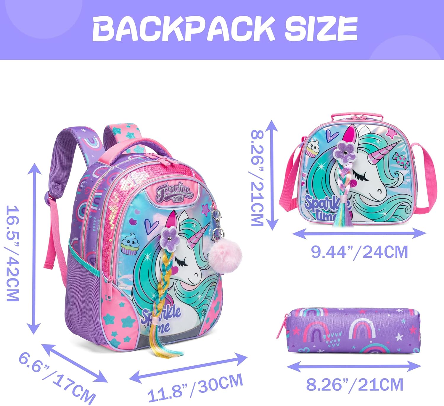 Dimensões: Mochilas escolares menina: 42 x 30 x 20 cm, lancheira de almoço: 23 x 20 cm, estojo: 23 cm. Tenha em conta que a mochila escolar não pode ser colocada sobre a bagagem. Não há painel na parte traseira para segurá-lo