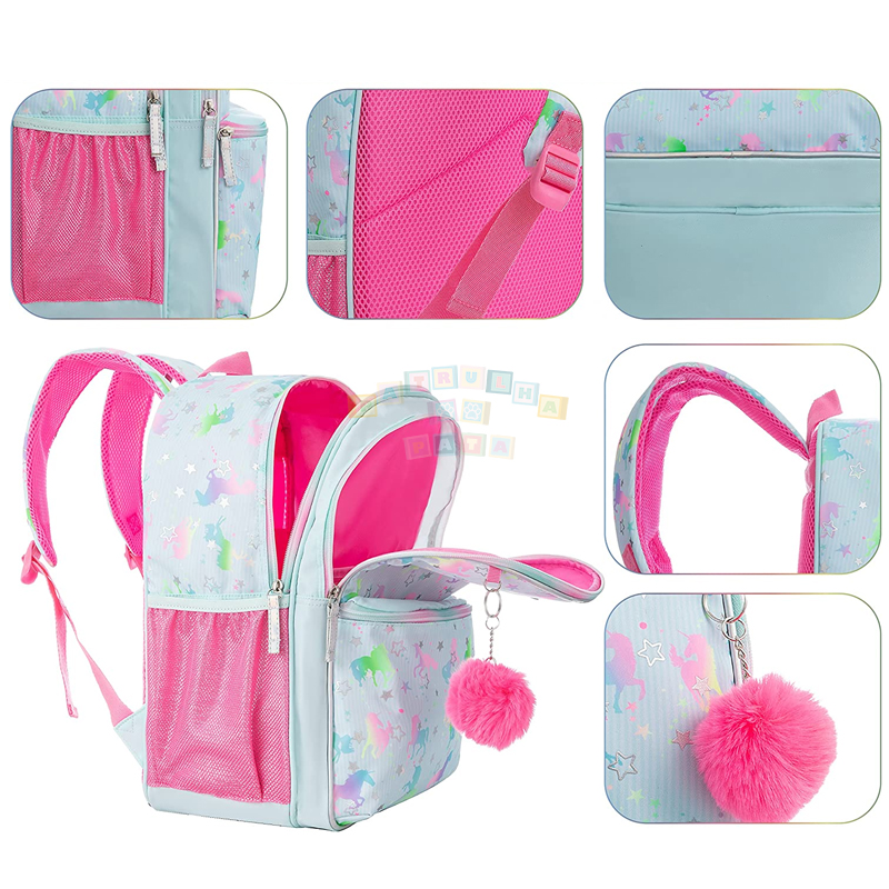 Mochila escolar para menina: 42 x 30 x 20 cm; Lancheira: 23 x 22 x 10 cm; estojo para lápis: 23 cm.