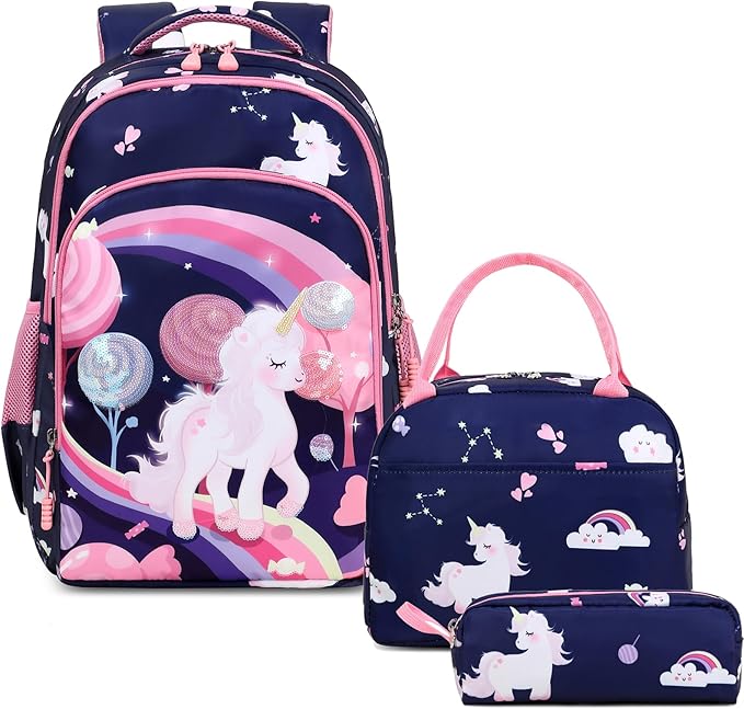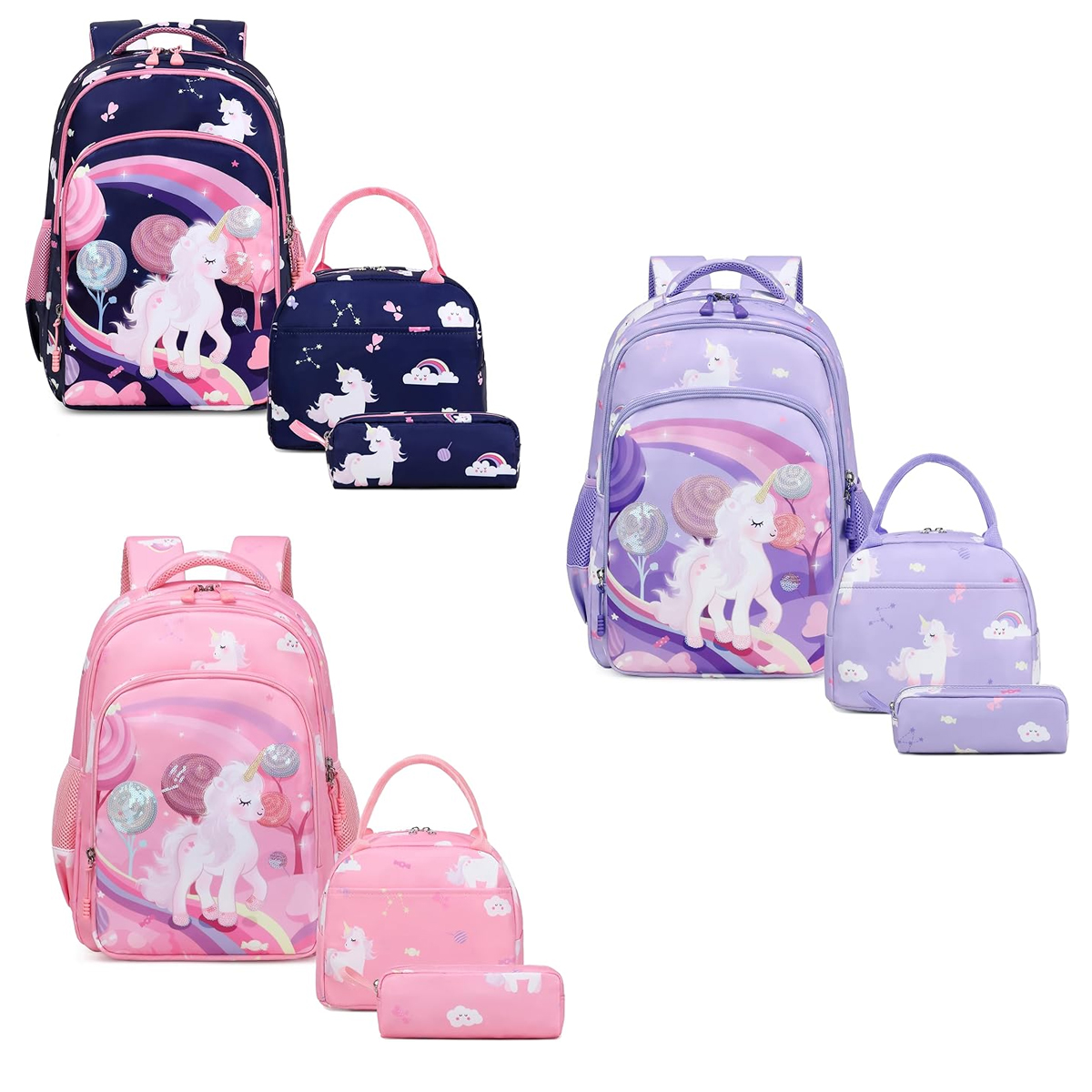 Conjunto Escolar Unicórnio - Mochila + lancheira + porta-lápis - 3 cores