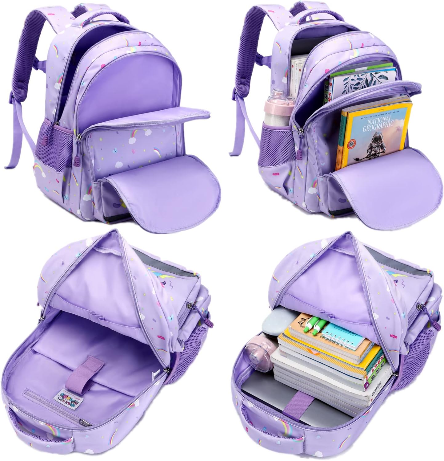 Grande capacidade - a mochila possui 1 compartimento principal espaçoso com uma camada intermédia acolchoada para o portátil, 1 compartimento intermediário e 2 bolsos frontais com fecho de correr para que as crianças possam organizar ordenadamente o seu material escolar e de uso diário. Esta mochila escolar tem 2 bolsos laterais de malha para uma garrafa de água e um guarda-chuva.