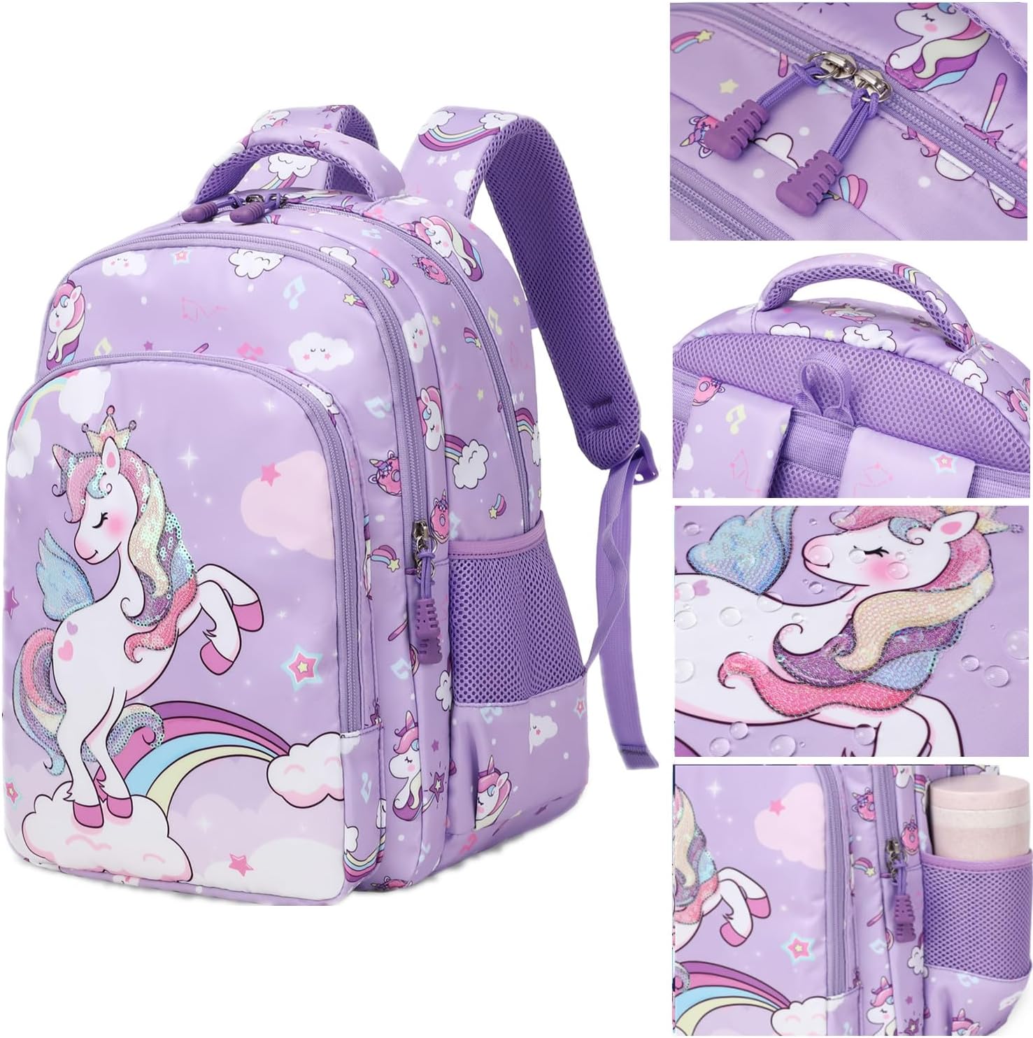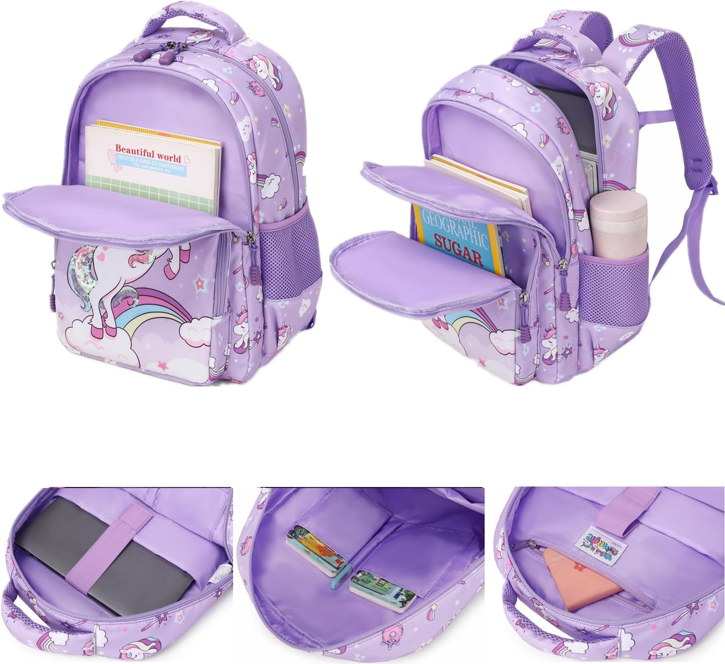 Grande capacidade - a mochila possui 1 compartimento principal espaçoso com uma camada intermédia acolchoada para o portátil, 1 compartimento intermediário e 2 bolsos frontais com fecho de correr para que as crianças possam organizar ordenadamente o seu material escolar e de uso diário. Esta mochila escolar tem 2 bolsos laterais de malha para uma garrafa de água e um guarda-chuva.