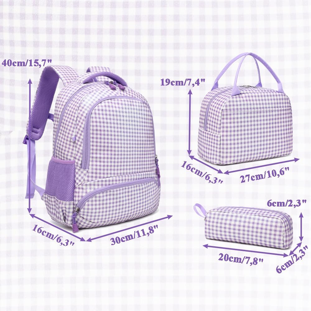 Mochila para meninas: conjunto de mochilas purpurina 3 em 1 para meninas com mochila com purpurina lancheira e bolsas. Bonito! Com tecido roxo, a mochila brilha ao sol. Mochila espaçosa para meninas - tamanho da carteira, 30 x 16 x 40 cm (11,8" x 6,3" x 15,7"); esta mochila primária para meninas é adequada para o ensino fundamental Detalhes cuidadosos - as alças da mochila para meninas não são apenas cobertas com uma camada refletora, mas também têm uma fivela no peito. Isso permite manter a mochila estável. Artesanato de precisão: esta mochila escolar cuidadosamente elaborada para meninas é costurada com precisão e possui um fecho de correr liso de alta qualidade, o que torna a mochila resistente e duradoura. Esta mochila para meninas: esta mochila primária para meninas tem 1 compartimento principal com 1 compartimento para portátil de 15", 2 bolsos frontais (um superior e outro inferior), 2 * bolsos laterais. Pode ser bom para agrupar artigos escolares. facilita a organização dos artigos na mochila.