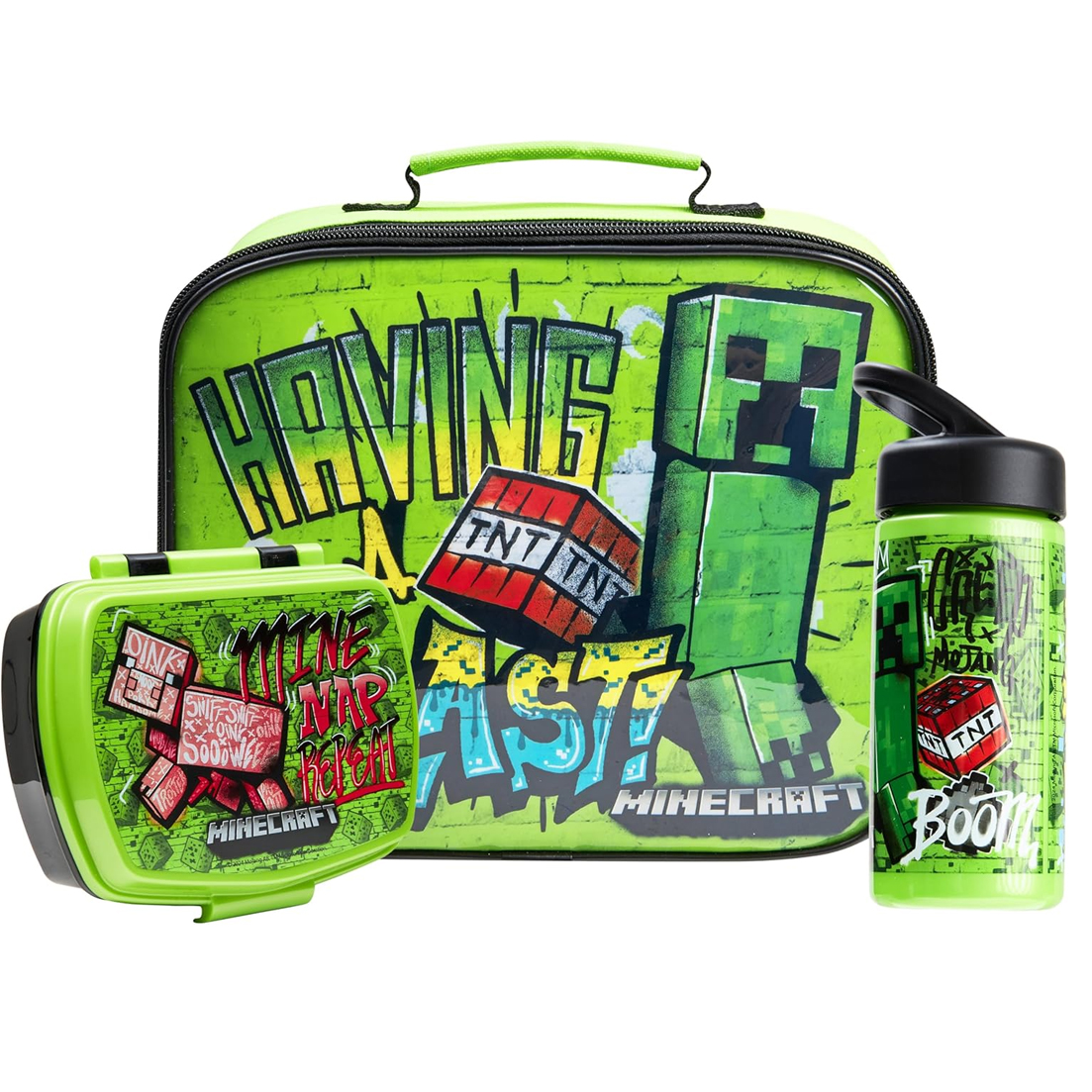 Design temático de minecraft: Este conjunto de lancheira infantil, garrafa e lancheira térmica está decorado com personagens e gráficos emblemáticos de Minecraft, excelente para os fãs do jogo Lancheira infantil segura e prática: Lancheira Minecraft mantém os alimentos frescos e bem organizados, sendo fácil de abrir e fechar para as crianças Garrafa de água Minecraft sem BPA: Este conjunto de lancheira infantil inclui uma garrafa de água Minecraft correspondente, exclusiva para manter as crianças hidratadas na escola ou em excursões. Conjunto de almoço infantil de 3 peças: Este conjunto de lancheira infantil inclui tudo o que o seu filho precisa para um almoço completo fora de casa: uma lancheira isotérmica, uma caixa para lanche e uma garrafa de água (à prova de fugas com a tampa fechada). Presente excelente para pequenos gamers: Esta lancheira e garrafa infantil são um ótimo presente de minecraft para fãs de meninos e meninas de Minecraft, prático e divertido para o uso diário