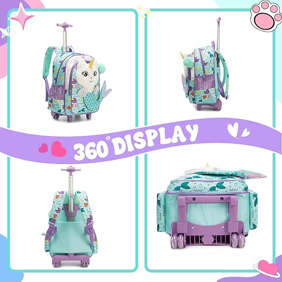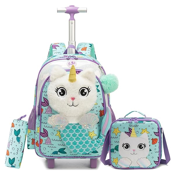 Dimensões: Mochila rodas menina: 42 x 30 x 20 cm, lancheira: 23 x 20 cm, estojo: 23 cm Conjunto de 3 peças: Além da mochila escolar com rodas principal, este conjunto também inclui uma prática bolsa para lanche e um estojo. O bolso principal pode acomodar cadernos A4 e os bolsos laterais para garrafas de água. Os sacos também podem ser usados para guardar o lanche das crianças. O seu adorável design de pelúcia em cores brilhantes torna-a um presente ideal para o regresso à escola e para qualquer ocasião. Design: Este carrinho mochila escolar reduz efetivamente a pressão nas costas, mantém a saúde da coluna vertebral e protege-o do peso. Esta mochila escolar resistente com rodas é ideal para viagens diárias de ida e volta para a escola e para viagens.