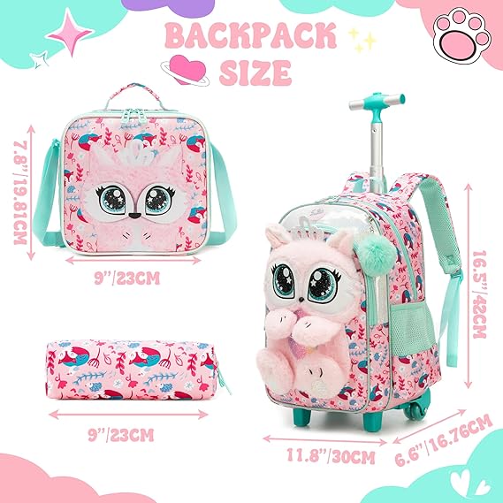 Dimensões: Mochila rodas menina: 42 x 30 x 20 cm, lancheira: 23 x 20 cm, estojo: 23 cm