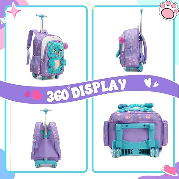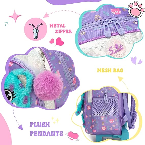Dimensões: Mochila rodas menina: 42 x 30 x 20 cm, lancheira: 23 x 20 cm, estojo: 23 cm Conjunto de 3 peças: Além da mochila escolar com rodas principal, este conjunto também inclui uma prática bolsa para lanche e um estojo. O bolso principal pode acomodar cadernos A4 e os bolsos laterais para garrafas de água. Os sacos também podem ser usados para guardar o lanche das crianças. O seu adorável design de pelúcia em cores brilhantes torna-a um presente ideal para o regresso à escola e para qualquer ocasião. Design: Este carrinho mochila escolar reduz efetivamente a pressão nas costas, mantém a saúde da coluna vertebral e protege-o do peso. Esta mochila escolar resistente com rodas é ideal para viagens diárias de ida e volta para a escola e para viagens.