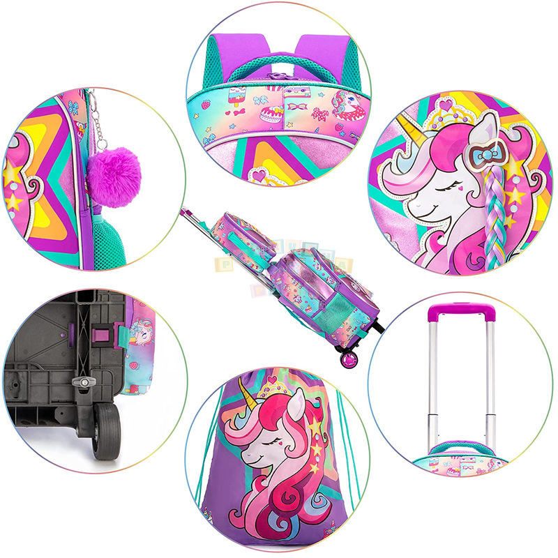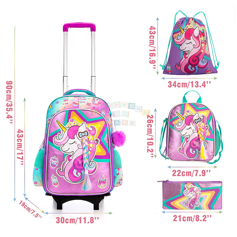 Conjunto Trolley Escolar Unicorn Star Hair - Trolley + Mochila + Lancheira + Porta-lápis + Saco Ginástica + porta-chaves