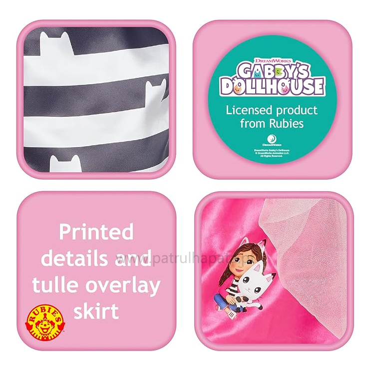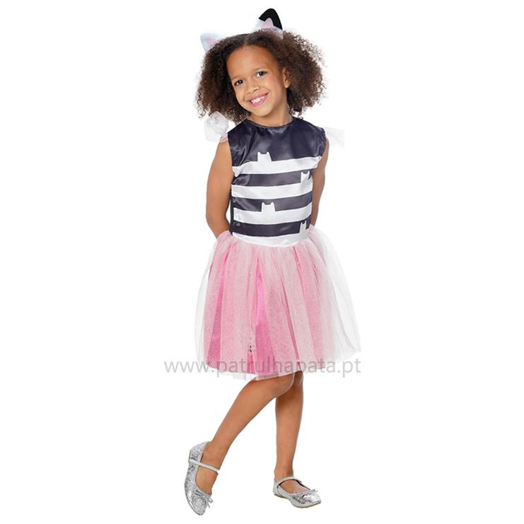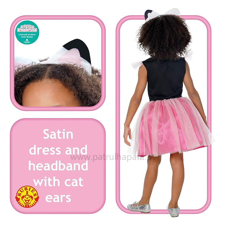 Vestido: Esta incrível fantasia Gabby Dollhouse inclui mini vestido sem mangas de cetim com riscas brancas e pretas, com estampado impresso digitalmente de silhuetas de gato e detalhes de manga em tule brilhante. O vestido apresenta uma saia em cetim rosa com sobreposição de tule branco e detalhes impressos de Gabby e Pandy Paws. Fecho de velcro traseiro para facilitar a colocação