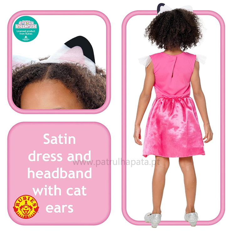 Vestido: Esta fantasia clássica Gabby inclui mini vestido com detalhes impressos digitalmente Gabby e saia com motivos listrados e silhuetas de gatos. Fecho de velcro traseiro para facilitar a colocação
