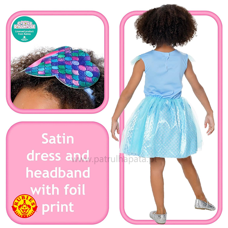 Vestido: Esta incrível fantasia Mercat Tutu inclui mini vestido sem mangas de cetim com detalhes impressos da Mercat no torso e detalhes de manga de tule brilhante. O vestido apresenta uma saia de cetim com sobreposição de tule. Fecho de velcro traseiro para facilitar a colocação