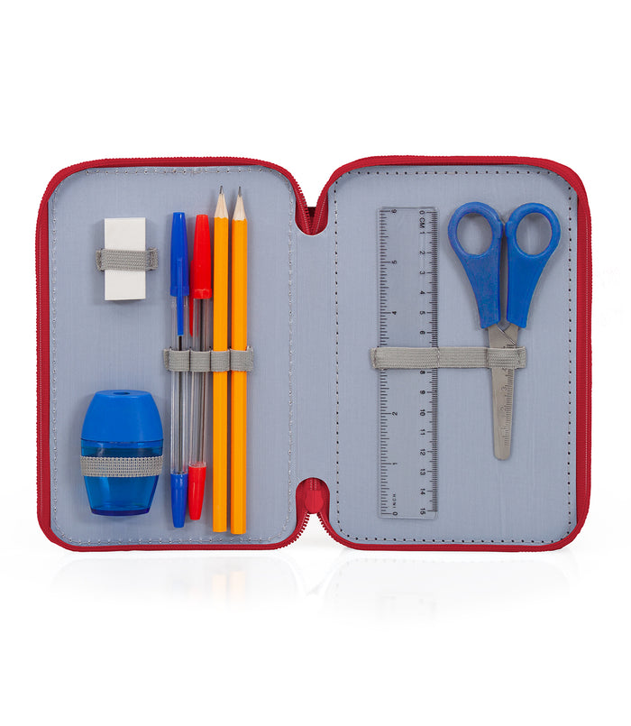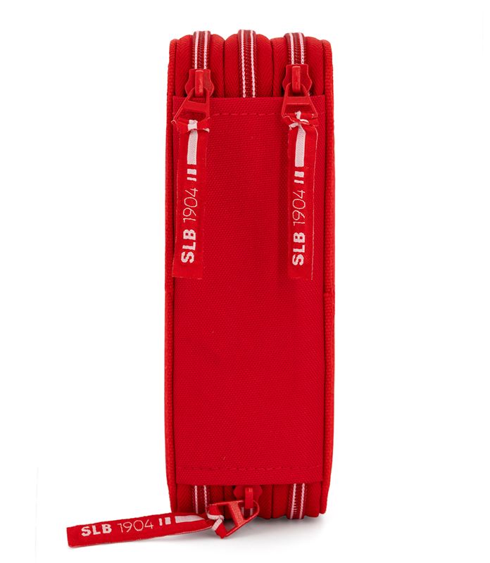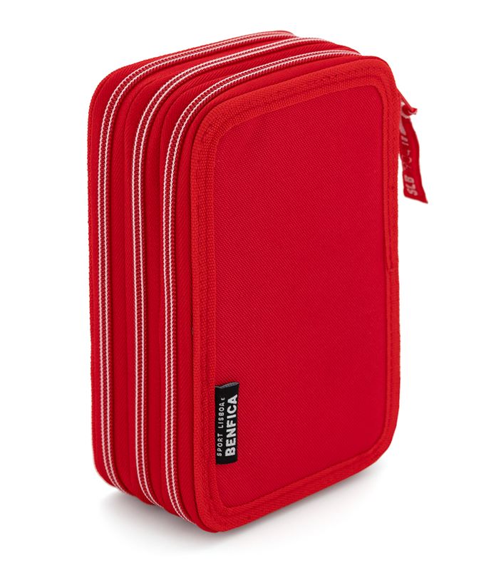 Estojo SL Benfica de 3 fechos, com material escolar e de desenho. Fabricado em poliéster vermelho resistente com interior rígido, forrado. Organizado em três tabuleiros: