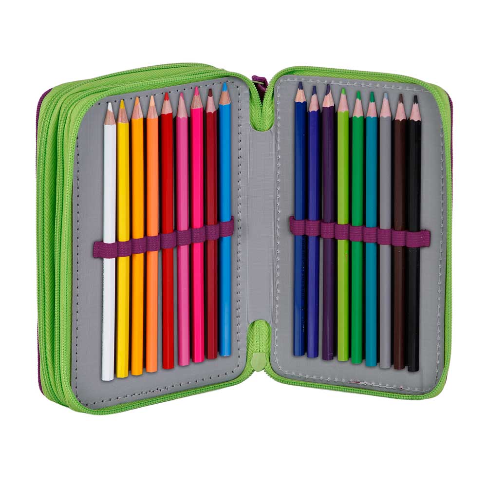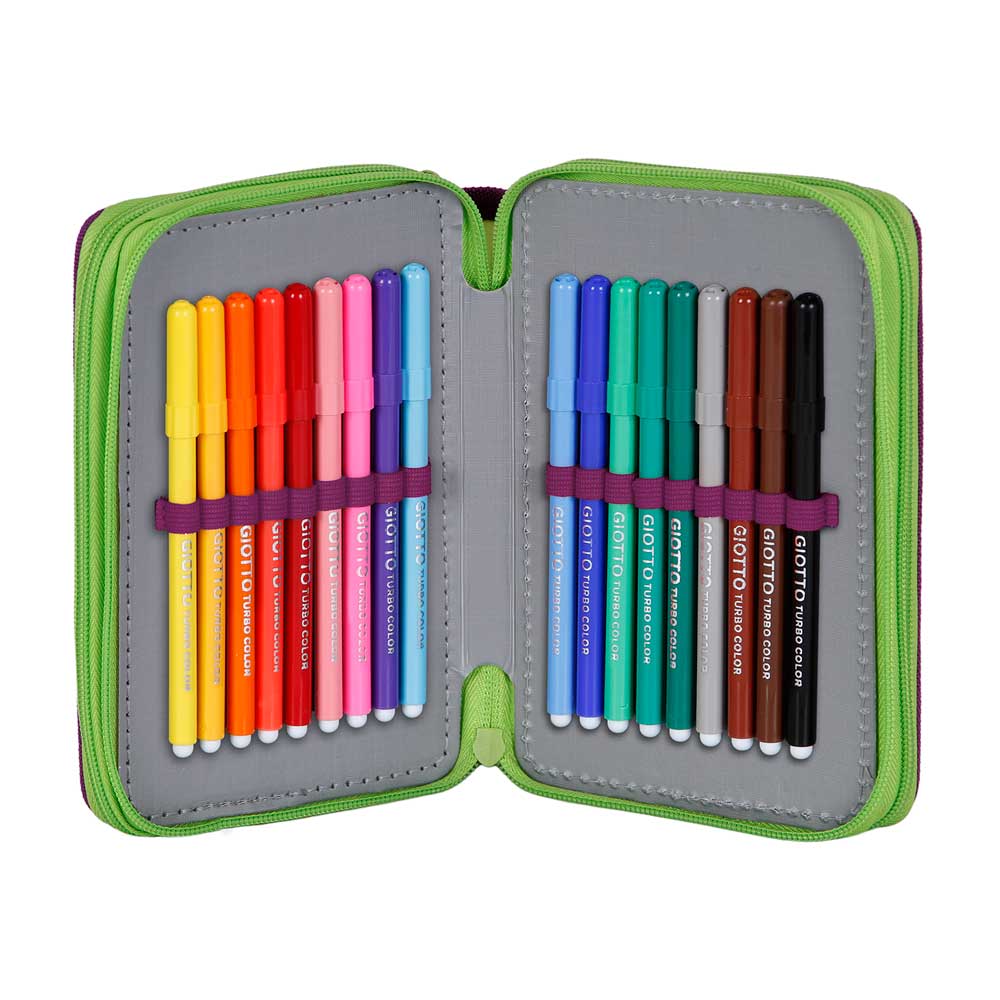 Tamanho: 21x14x7cm. Caso escolar completo. 3 compartimentos e fechamento com zíper. Contém bloco de notas, régua, apontador, borracha, lápis e 2 canetas. 18 lápis de cor e 18 marcadores de cor