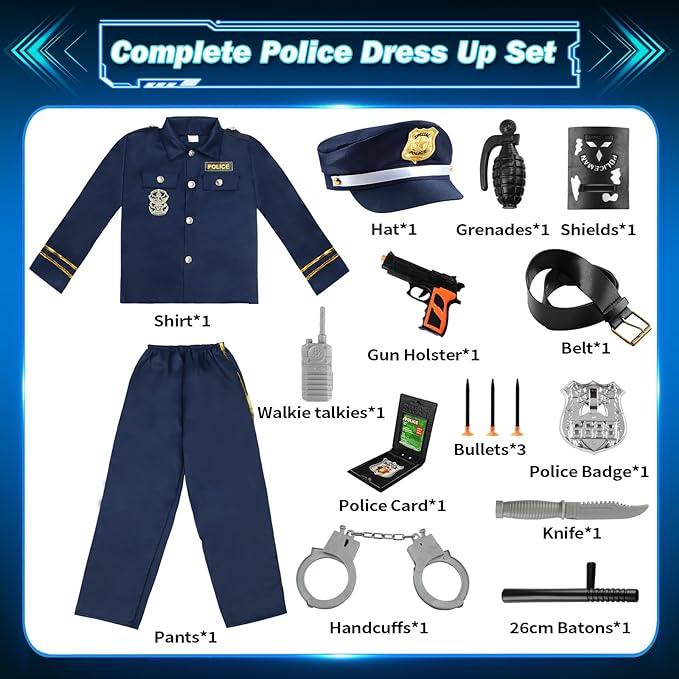 As roupas de polícia da equipa de polícia Playset vêm com tudo o que os seus filhos precisam para a melhor experiência da polícia, incluindo: camisa de polícia, calças, chapéu, cinto, walkie-talkies, esposas, 26 cm Batons, capa de arma, 3 balas, granadas, faca, Insígnia da polícia, escudos, cartão de polícia,