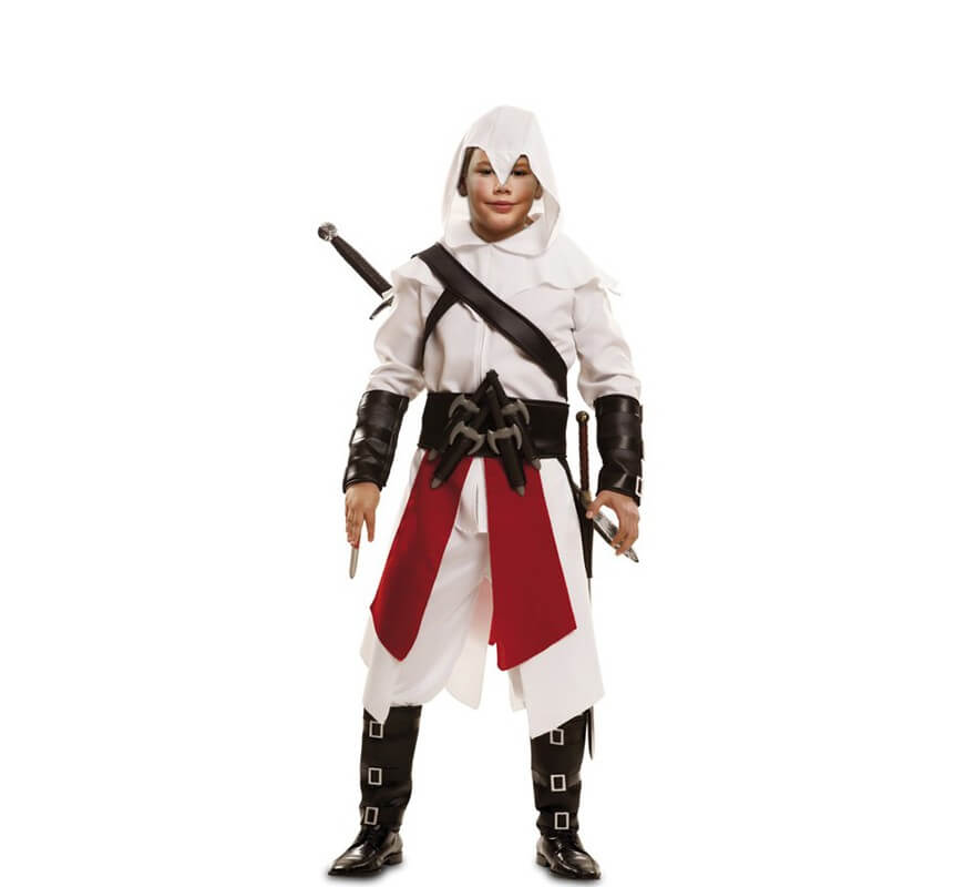 Fato de Guerreiro Branco ou Assassino para criança. Inclui capuz, camisa, saia, calças, caneleiras, braçadeiras e alça de ombro. Não inclui armas nem calçado