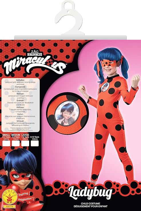 Disfarce Miraculous Ladybug Tiki Classic para meninas, jumpsuit com detalhes impressos e logótipo tikki no peito com máscara a condizer. Fecho de velcro traseiro para facilitar a colocação. Esta fantasia foi desenhada com material adequado em poliéster par longos dias de brincar e diversão. Devidamente embalado na sua mala.