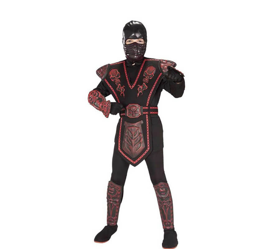 Fato o Disfarcede guerreiro Ninja vermelho para crianças. Inclui macacão com capuz, peito, capas para pernas, capas para braços EVA e máscara. Não inclui luvas ou sapatos.