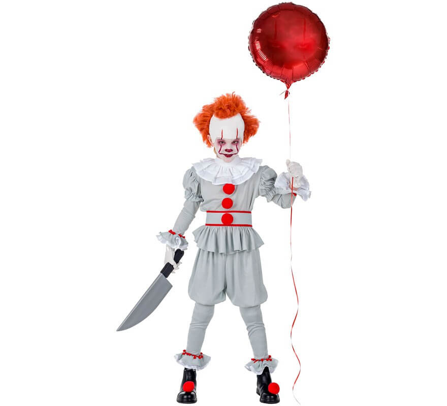Fato o Disfarcede palhaço assustador para menino. Inclui pescoço, blusa, faixa, calças e borlas para sapatos. Não inclui balão, peruca, luvas, faca ou sapatos