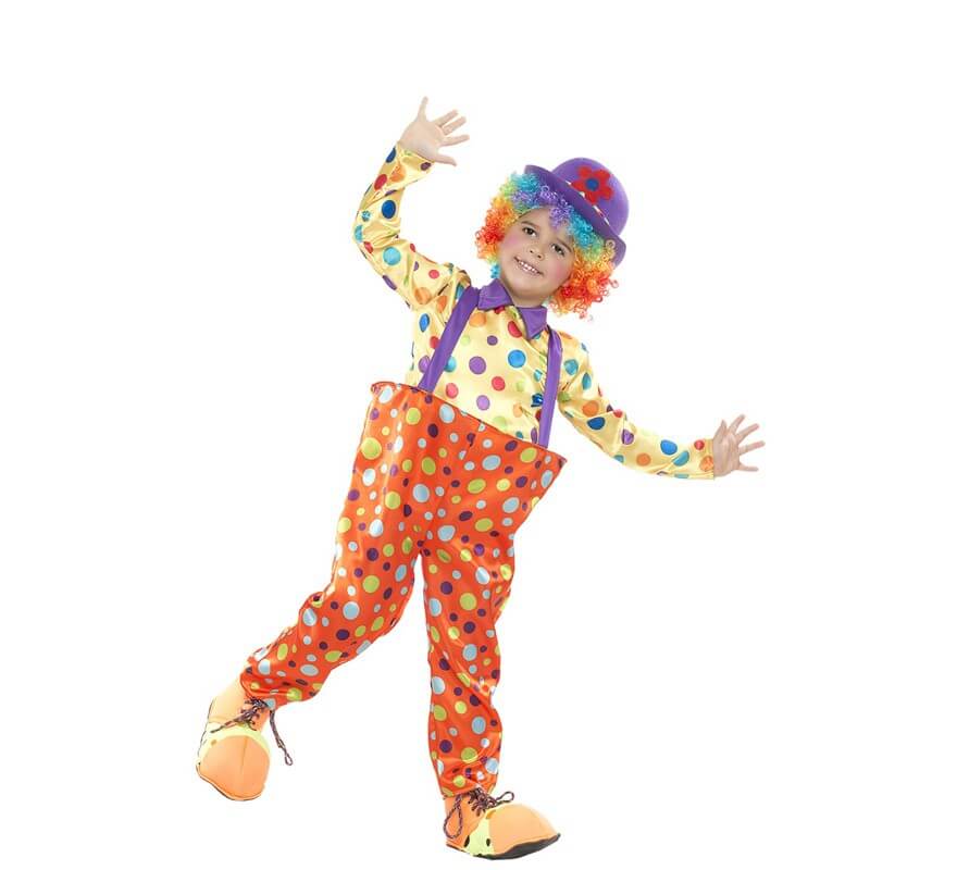 Fato o Disfarcede palhaço, palhaço ou palhaço ou palhaço polka dot para menino. Inclui camisa, calças com suspensórios. Não inclui sapatos, chapéu ou peruca.