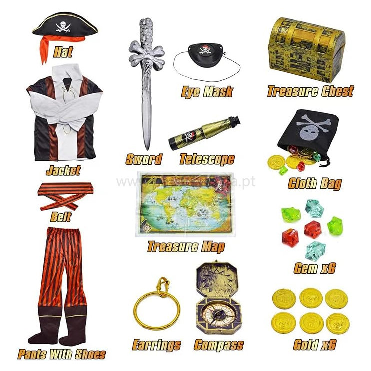 Home Piratas Fato de Pirata completo com acessórios Fato de Pirata completo com acessórios SKU: B0BKFFXTPR Tamanhos 7-9 10-12 43,00 € Desconto de %. IVA incluído. Comprar Contactar Adicionar à wishlist Fato de Pirata completo com acessórios Conteúdo do pacote: disfarce de pirata infantil composto por: 1 camisola, 1 calça, 1 cinto, 1 chapéu, 1 espada, 1 pala, 1 arca tesouro, 1 binoculos, 1 saco joias, moedas, mapa, bussola, brinco. Tags CarnavalFato CarnavalDisfarcePirataPiratas Características Partilhar