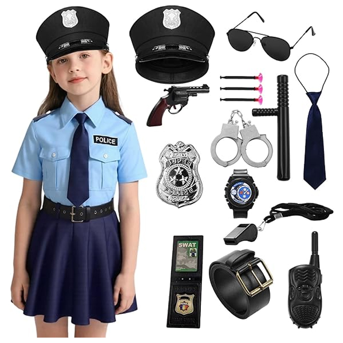 Fantasia de Policial para Meninas: O conjunto inclui: 1 uniforme de policial, 1 cinto, 1 chapéu de policial, 1 rádio comunicador, 1 distintivo, 1 par de óculos escuros, 1 apito, 1 cassetete, 1 par de algemas de brinquedo, 1 pistola de brinquedo e 1 faca de brinquedo. Este conjunto de uniforme de policial para meninas contém todos os acessórios necessários para uma fantasia completa, o suficiente para transformar sua filha em uma policial vigilante.