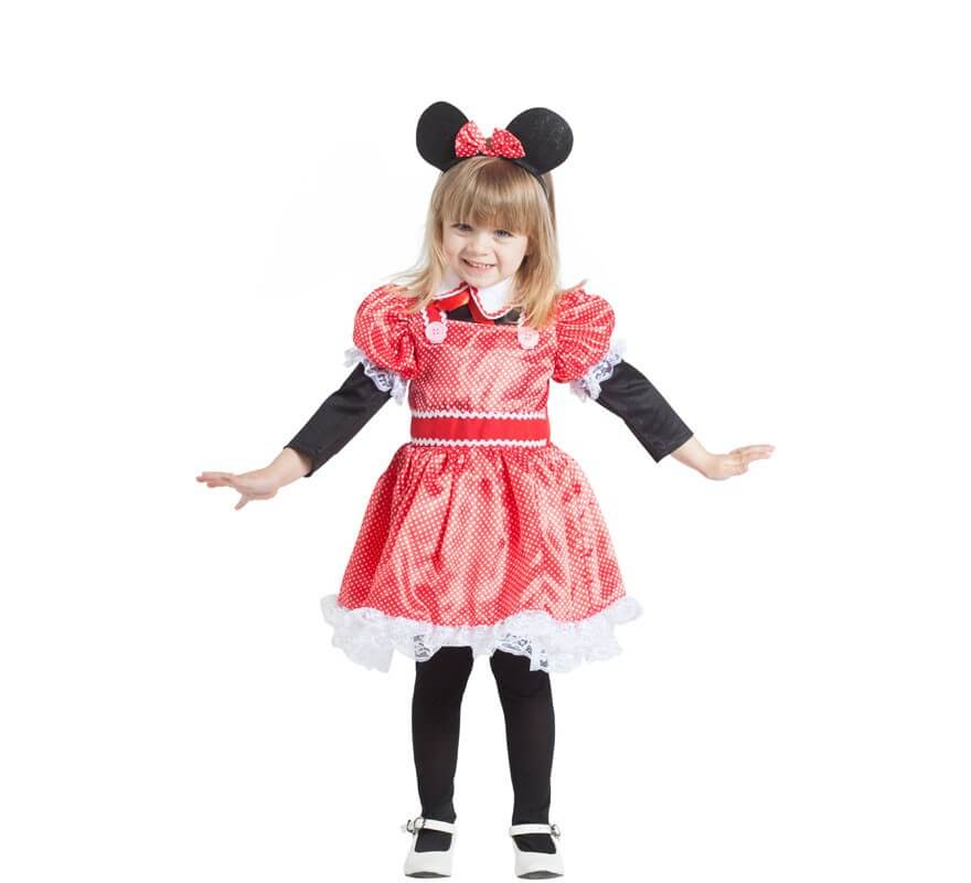 Fato o Disfarcede Rato pequeno ou Rato vermelho para bebês. Inclui bandana com orelhas e laço, pescoço, vestido com saia e camisa. Não inclui meias nem sapatos.