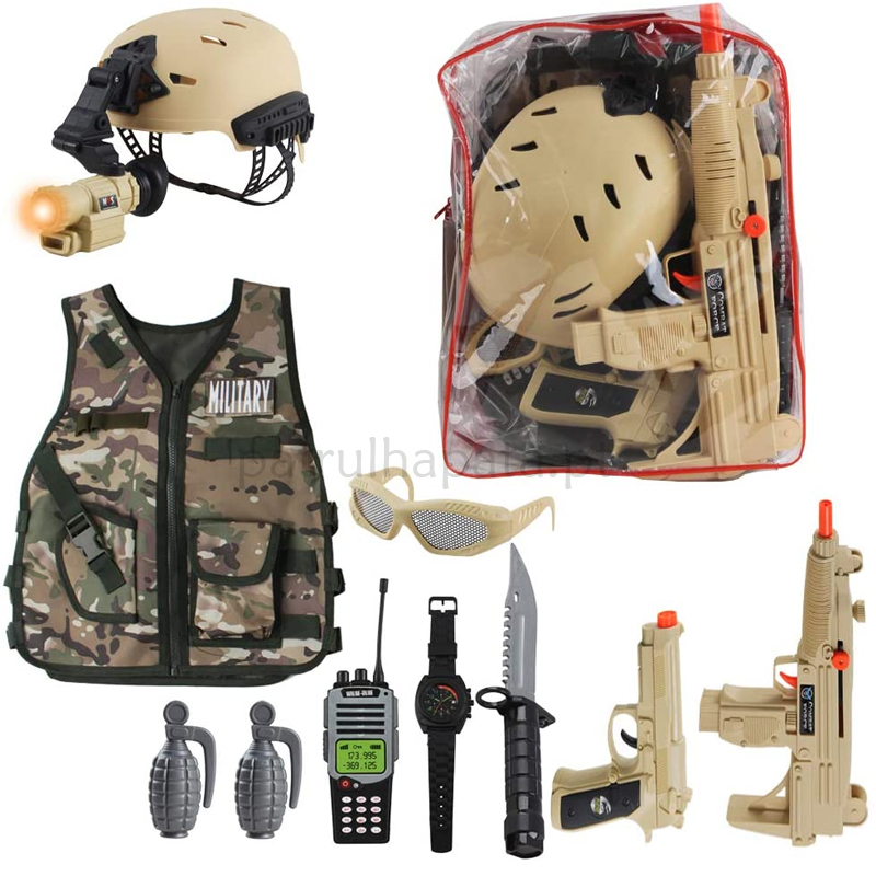 Este conjunto militar inclui colete de camuflagem, capacete de brinquedo, binóculos de walkie-talkie de brinquedo, armas de brinquedo e mochila de armazenamento