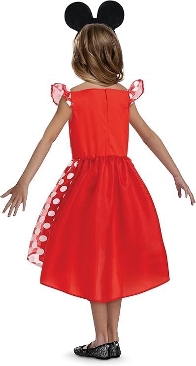 Disfarce mini rato menina vestido de alta qualidade com saia de bolinhas, ombros em forma de folhos com bolinhas e um broche de foto de Minnie. Também inclui diadema com os ouvidos e o famoso laço caraterísticos da Minnie.