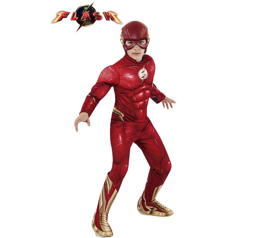 Fato de Flash Deluxe para criança. Inclui jersey de peça única com peito acolchoado, protetores de botas e meia máscara. Não inclui calçado. Item oficialmente licenciado do novo filme do universo DC de 2023