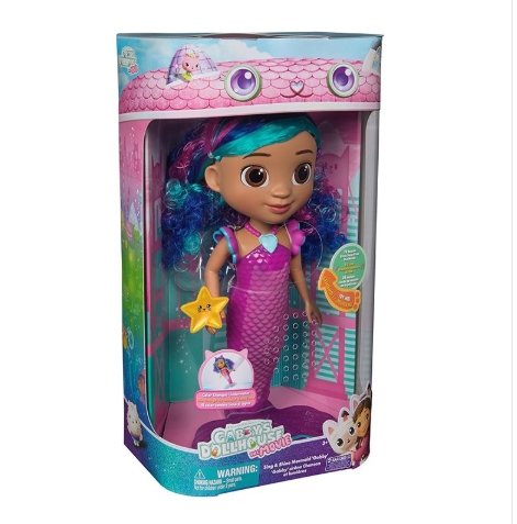Magia do filme de Gabby: Dê vida à sereia pressionando o pingente em forma de coração para ver o seu corpo iluminar-se e ouvir 14 efeitos sonoros, frases e música extraídas do filme Brinquedo sereia Meowgico: com mais de 35,5 cm de altura, esta boneca sereia é impermeável e possui uma cauda que muda de cor em água quente. A cauda é dobrável. Estimula o jogo criativo: esta boneca sereia convida as crianças a explorarem a sua imaginação graças às suas funções interativas. Construa o mundo de Gabby: Com quartos temáticos, móveis para a casa, figuras e playsets, cria um mundo de brincar que ajuda as crianças a desenvolver a imaginação através do jogo Inclui: 1 sereia Gabby, 1 acessório de estrela do mar Colecte-os todos: Os brinquedos da Gabby's Dollhouse são ideais para amantes de crianças em idade pré-escolar