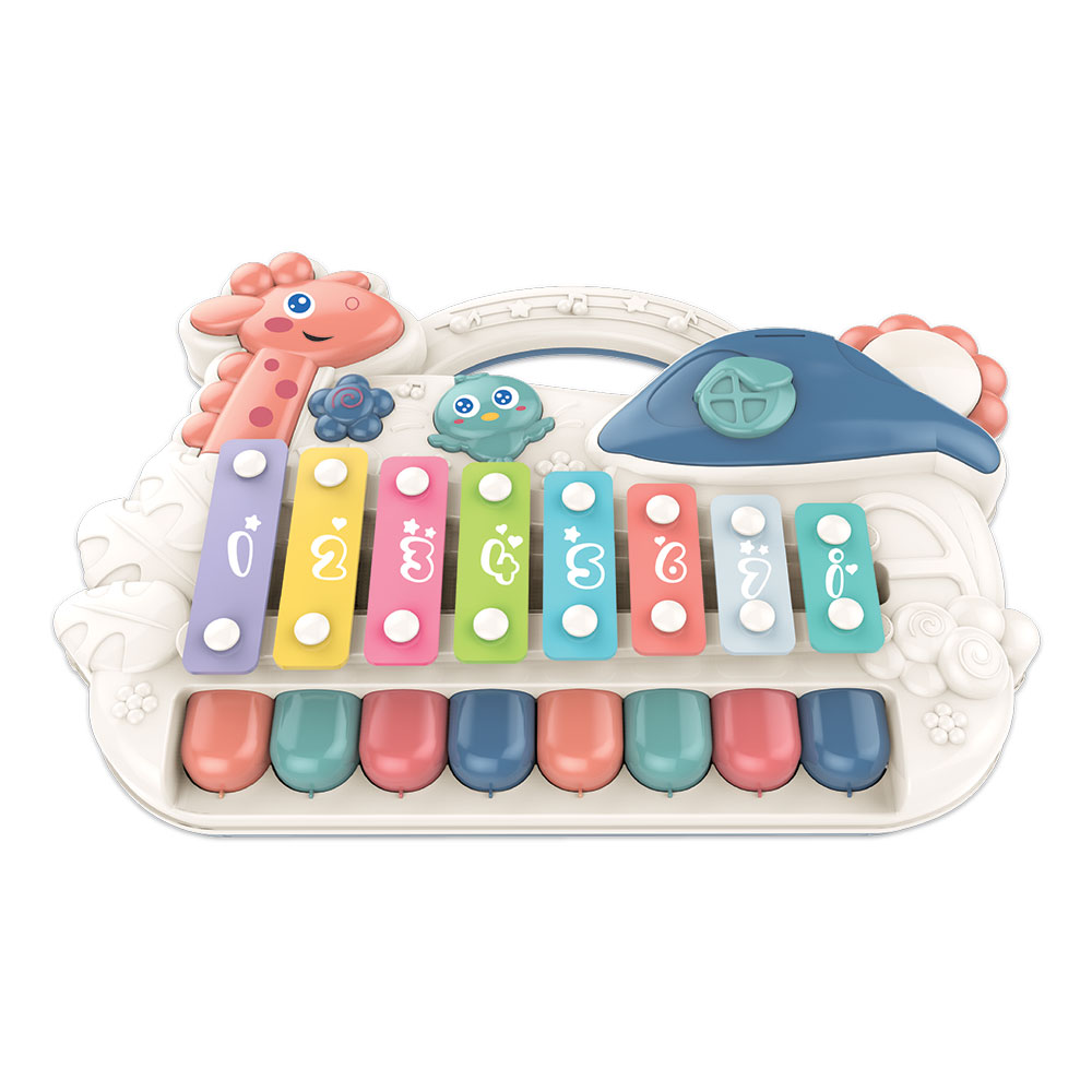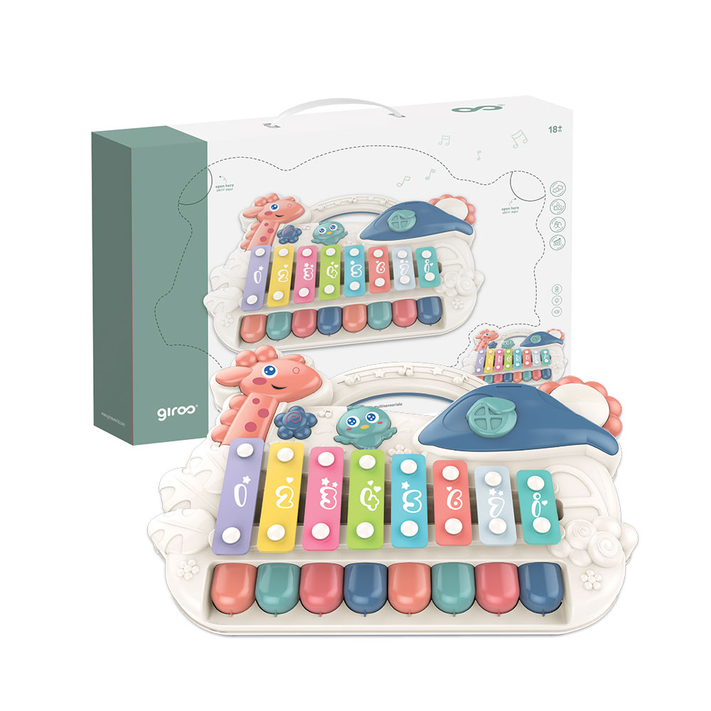 Fantástico piano musical com 8 notas para uma introdução do bebé ao universo da música. As premir as teclas do piano, existe um acessório mecânico que pulsa a respetiva tecla permitindo que o som emitido seja o som de uma tecla de xilofone. Com esta função, a criança consegue usufruir de um brinquedo 2 em 1: piano e xilofone. Existem ainda teclas interactivas onde podem ser escutados sons de animais.
