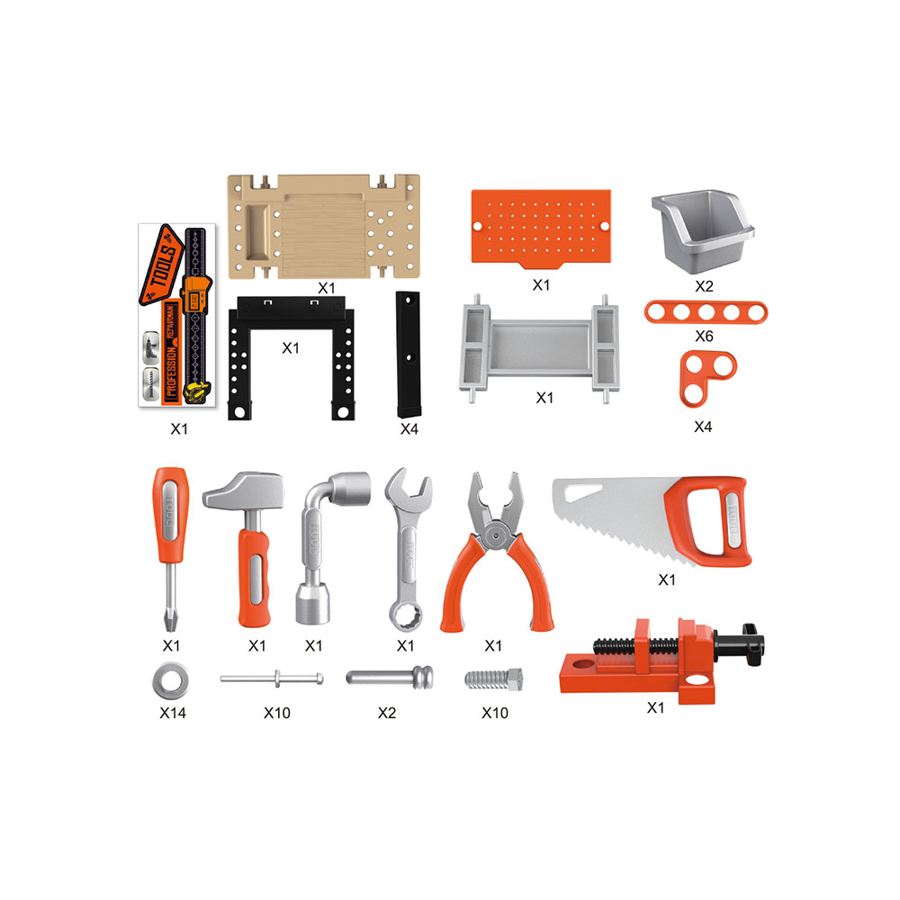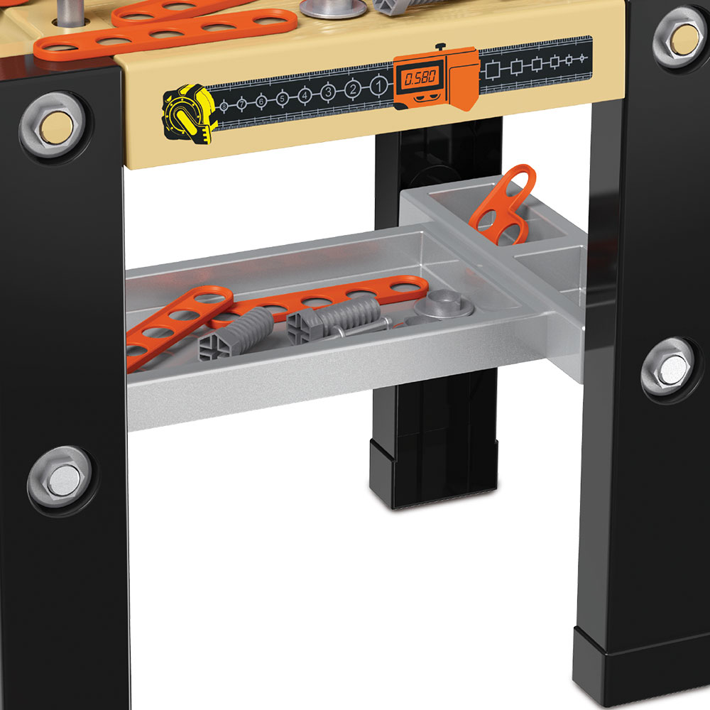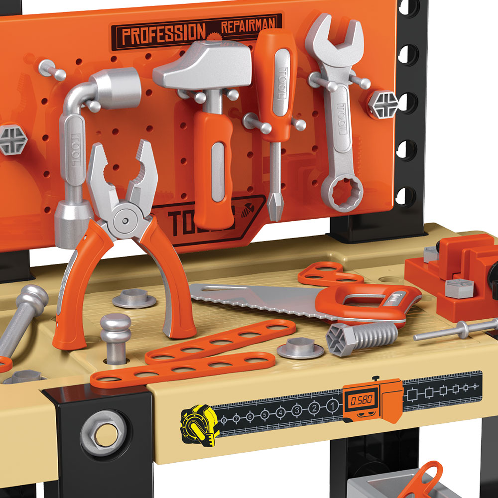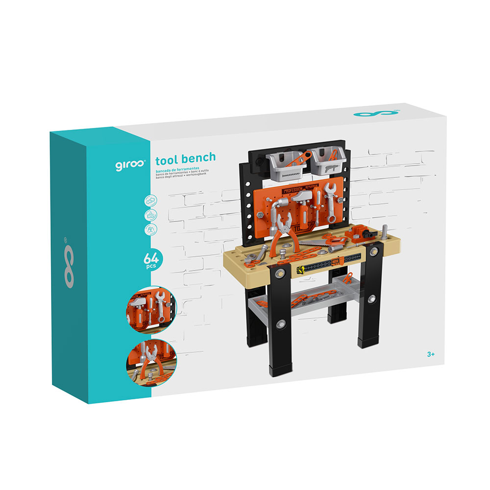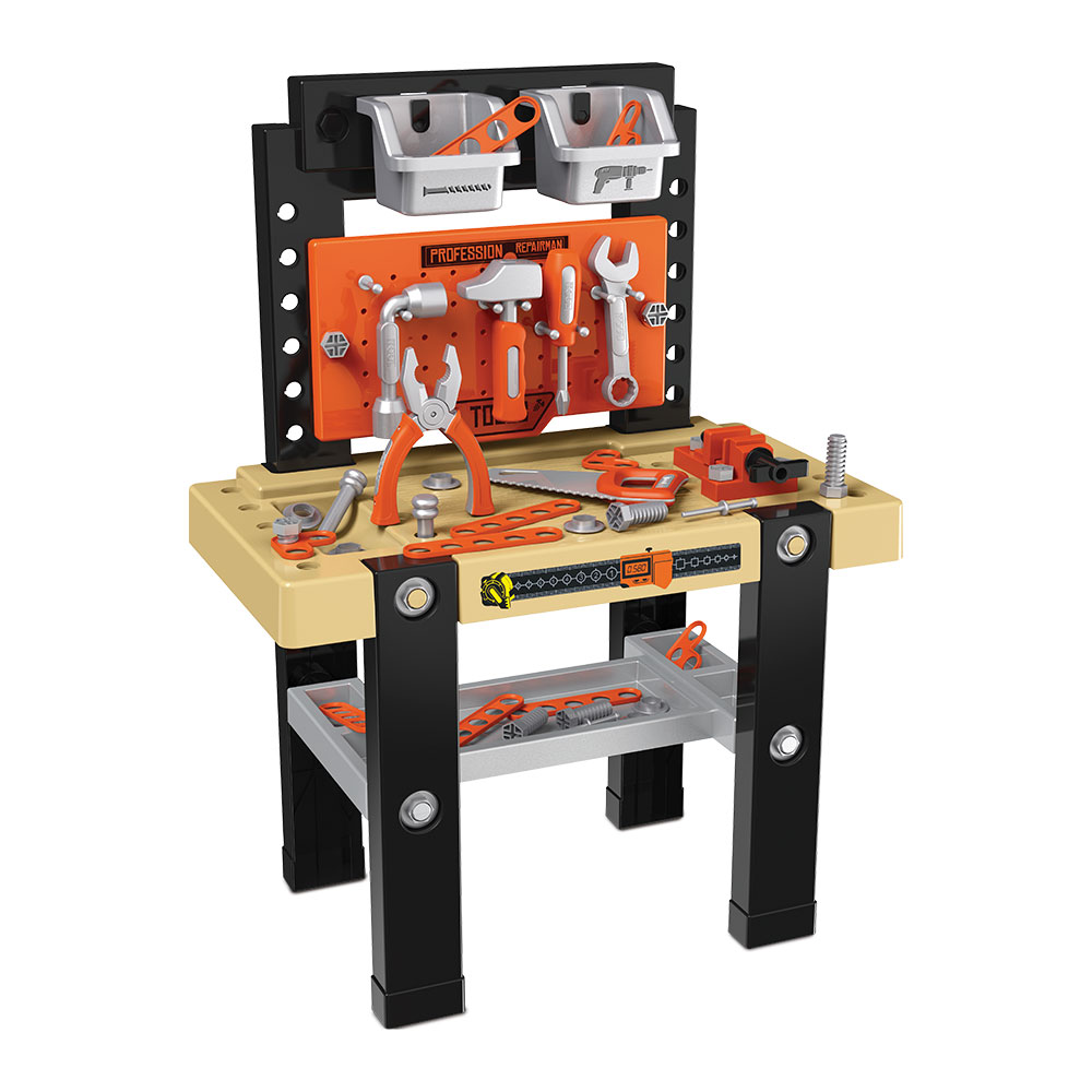 Conjunto de ferramentas em forma de bancada de trabalho. Permite à criança não apenas montar a sua bancada de ferramentas como também utilizá-la para imitar um conjunto de tarefas relacionadas com o mundo dos adultos. Incluí todos os acessórios necessários para brincar ao universo das ferramentas.