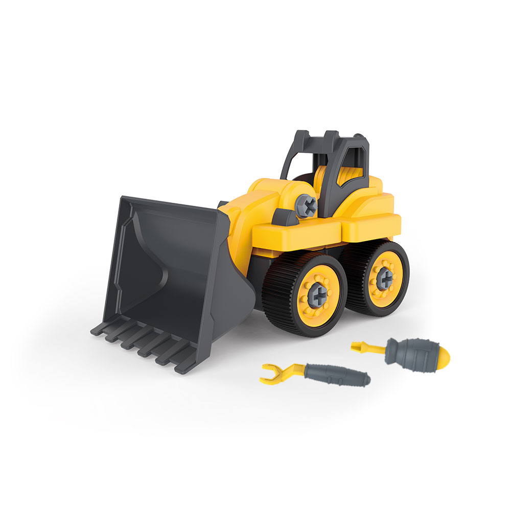 Veículo de construção com chave e parafusos para que a criança possa concluir a sua montagem e assemblagem.