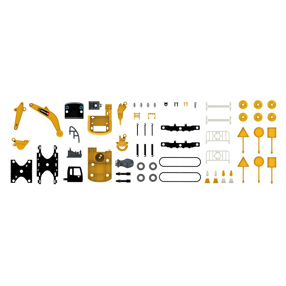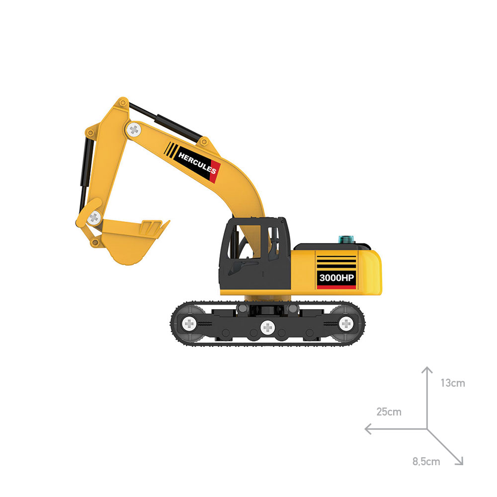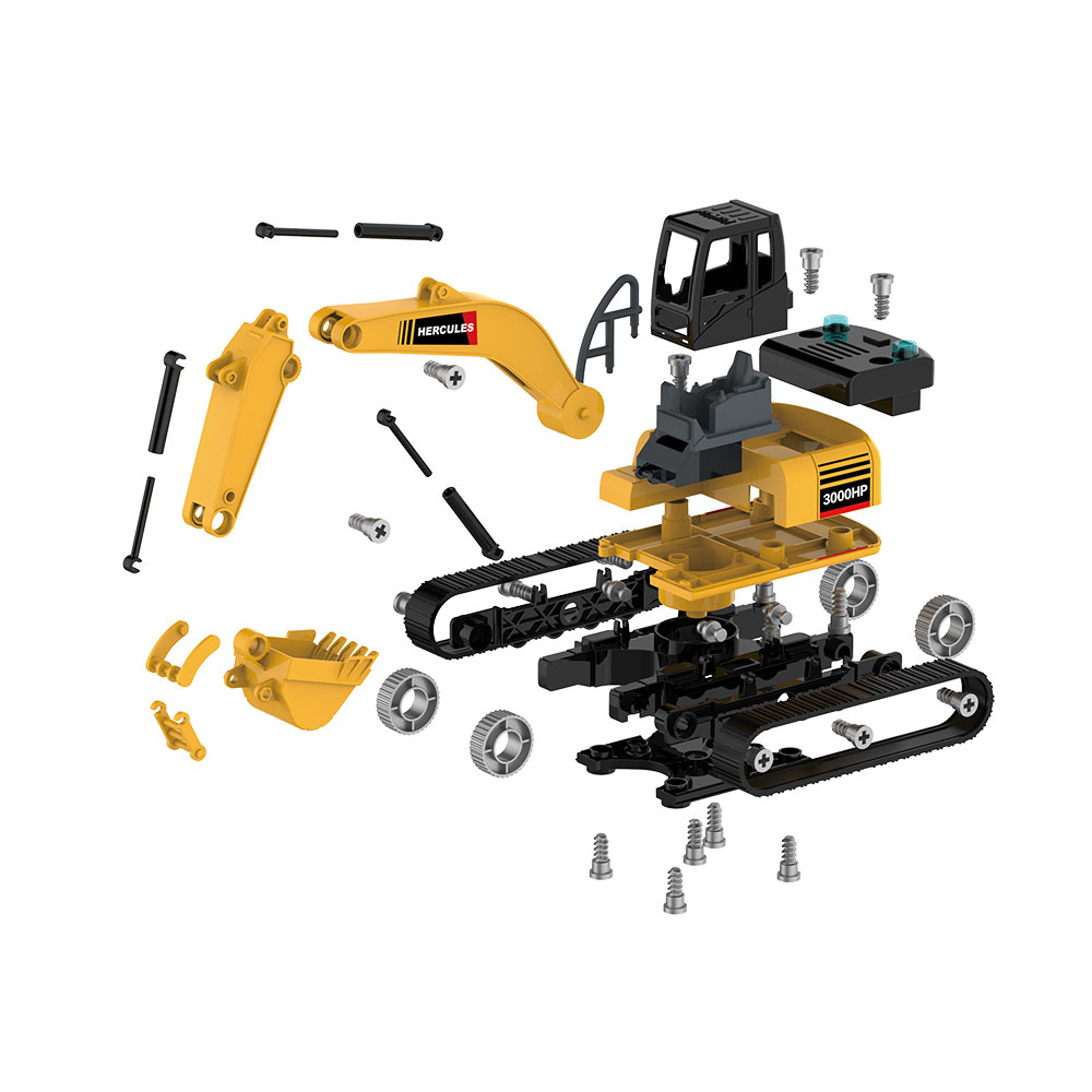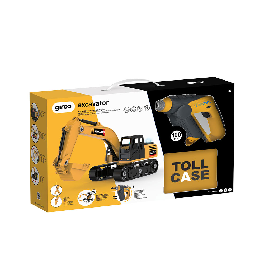 Malinha com peças incluídas para amontagem de Escavadora. Inclui aparafusadora com luz e sons para apertar engrenagens e montar o veículo de contrução. Acessórios de brincas incluídos como sinalizadores e outros sinais.