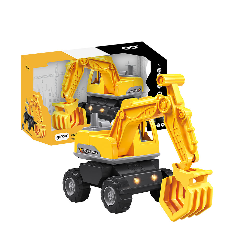 Veículo de construção com luzes e sons alusivos ao universo da construção civil para interação entre a criança e o meio envolvente.