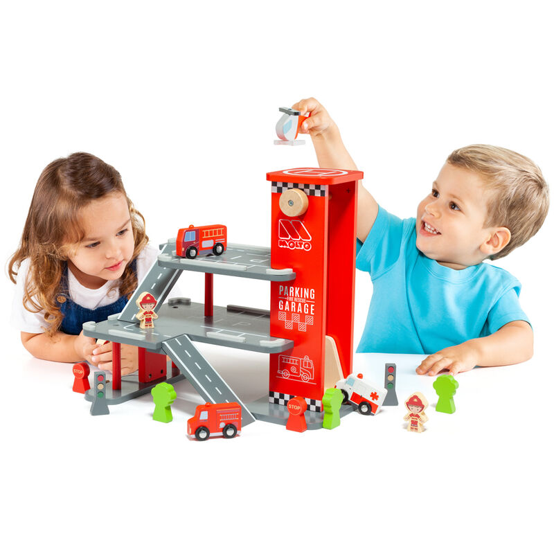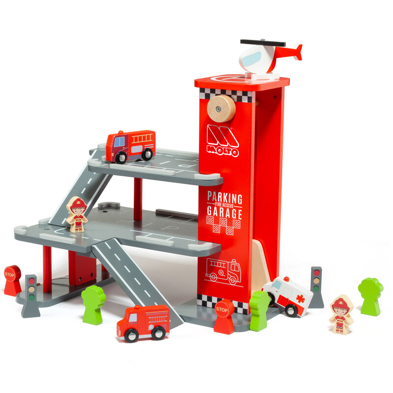 Idade: +36 meses. Tamanho: 47x39x11cm. Grande parque de estacionamento de brinquedos em madeira, com 3 níveis, heliporto, inclui 3 veículos com rodas reais, 1 helicóptero, 1 carro de bombeiros, 1 ambulância, 1 caminhão de emergência, 3 árvores, 2 semáforos, 2 sinais de parada e 2 bombeiros. São fabricadas em conformidade com o FSC, que utiliza madeira de manejo florestal uso ambientalmente adequado, socialmente benéfico e economicamente viável das florestas do mundo. Os brinquedos de madeira da Molto Nature são pintados à mão, com cores à base de água, não tóxico, obedecendo às mais rigorosas normas de segurança.