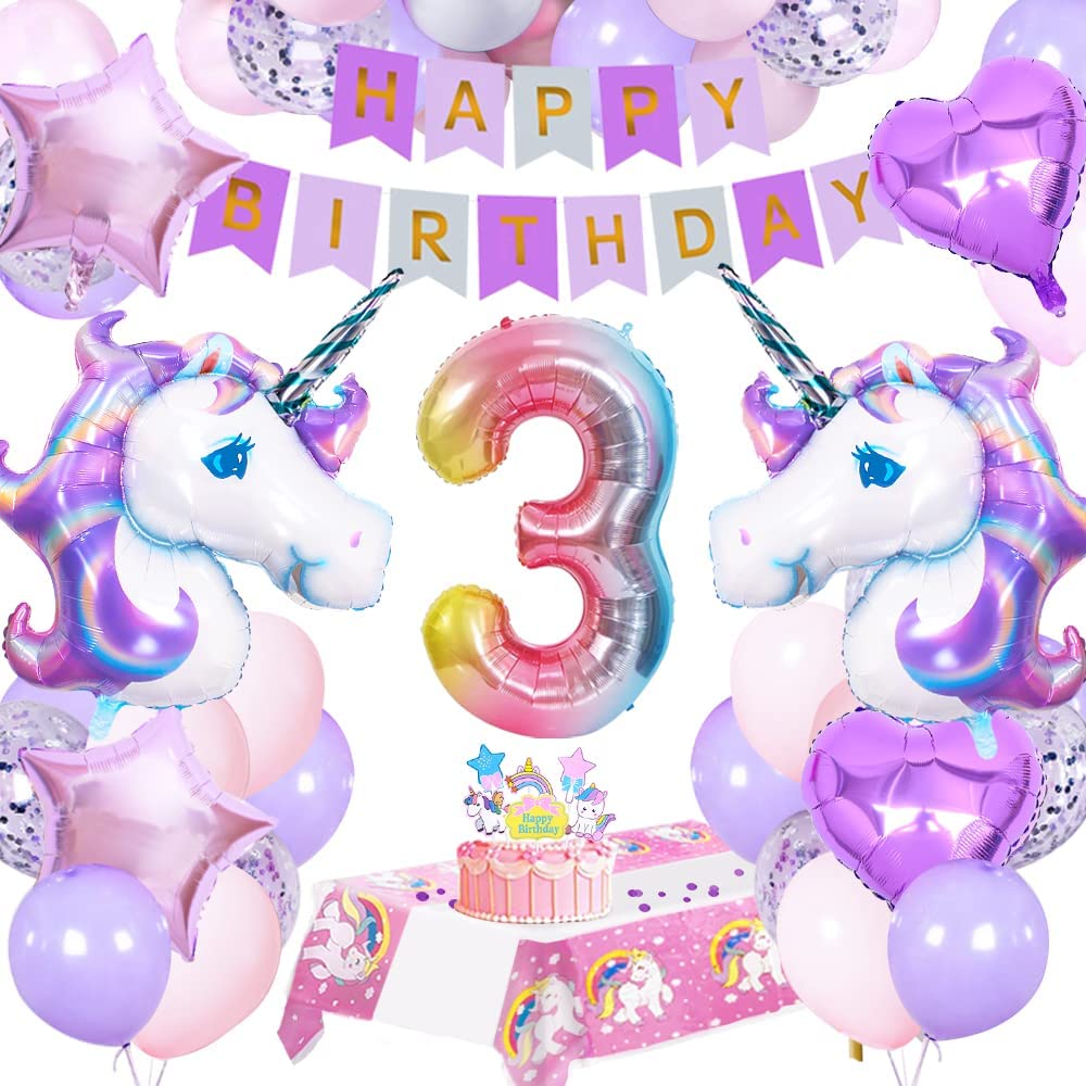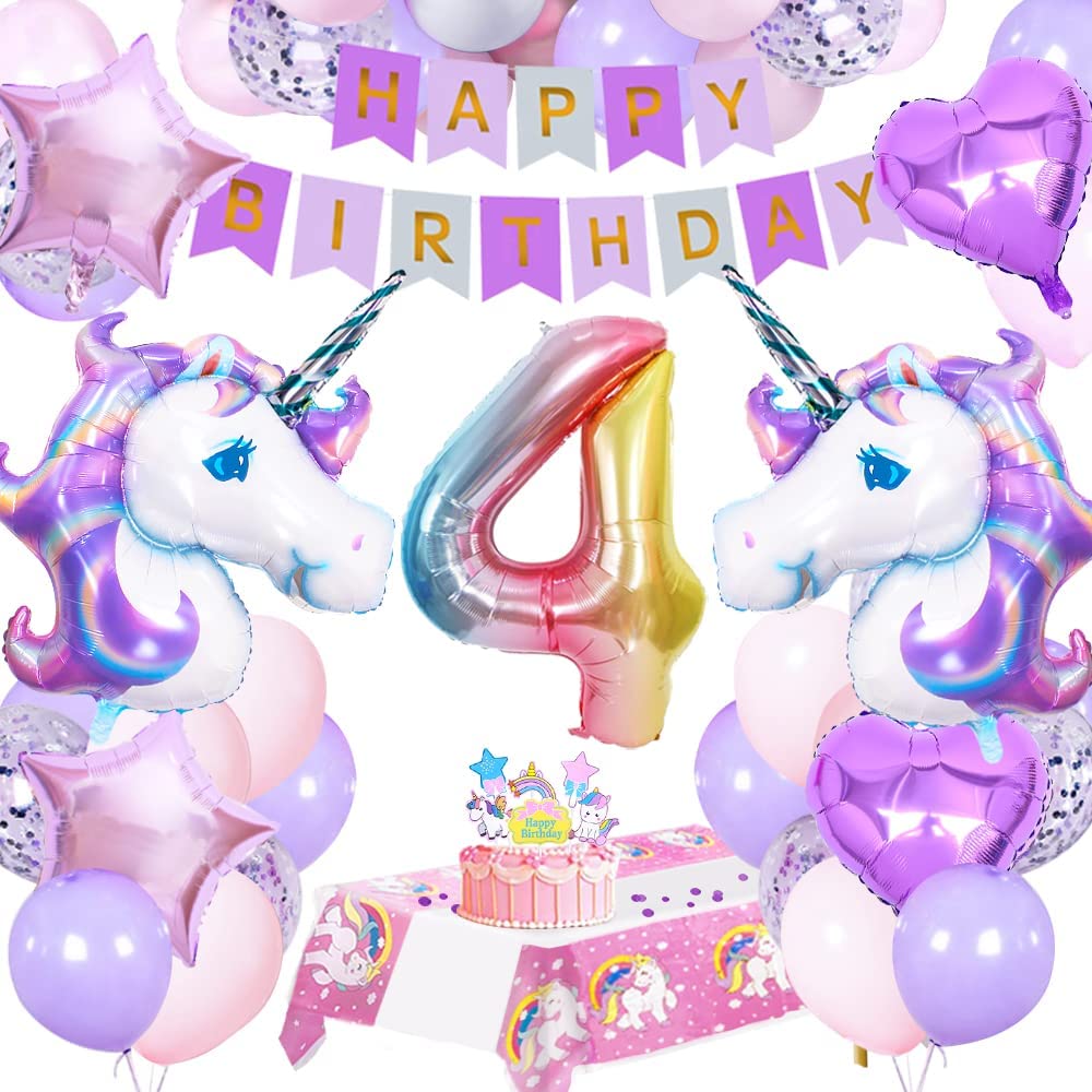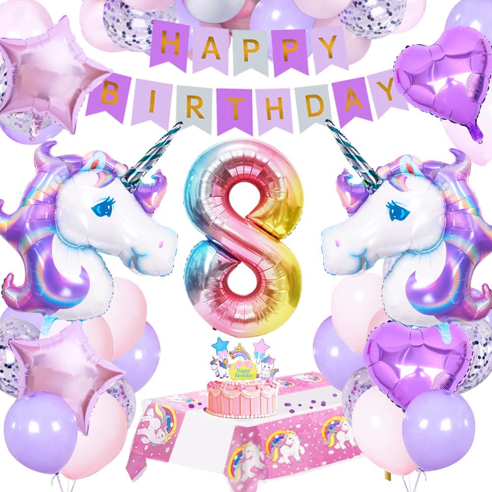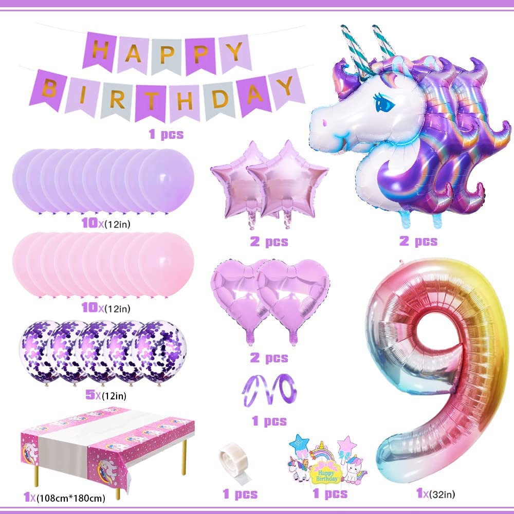 2 balões grandes de unicórnio roxos, 1 balão de alumínio com número, 10 balões de cor roxa claro (30 cm), 10 balões cor-de-rosa (30 cm), 5 balões de confetis (30 cm), 2 balões estrela, 2 balões de coração,1 faixa de feliz aniversário, 1 toalha de unicórnio, 1 ornamento de bolo de unicórnio