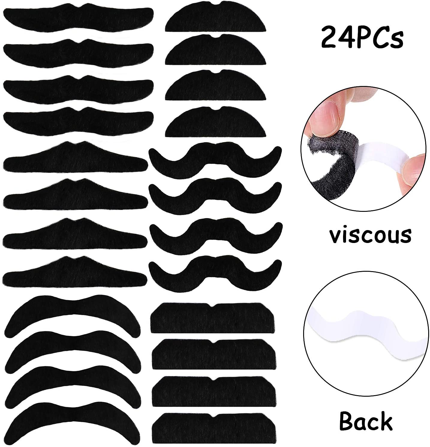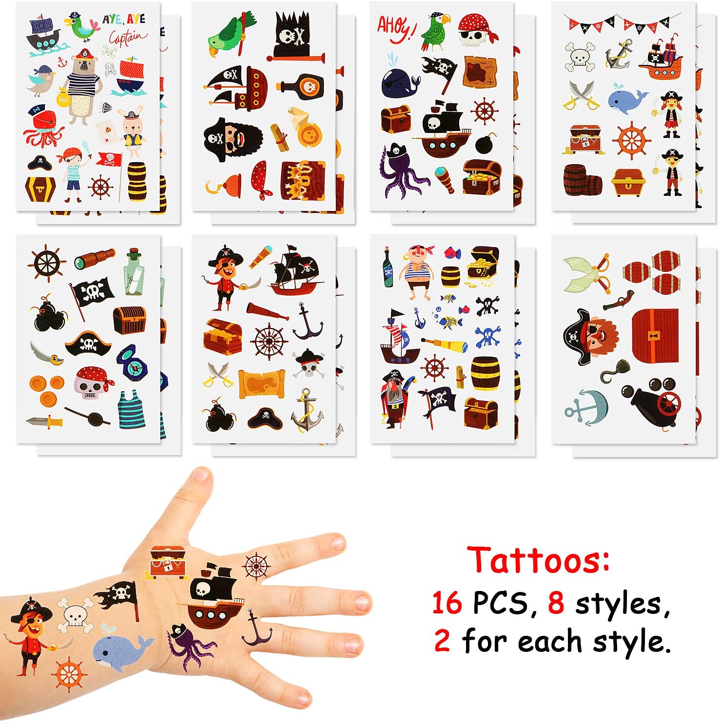 12 pulseiras de piratas com 4 estilos, 12 peças de anéis de piratas com 4 estilos, 12 porta-chaves de piratas com 6 estilos, 16 folhas de tatuagens de pirata, 12 palas de piratas e 24 bigodes.