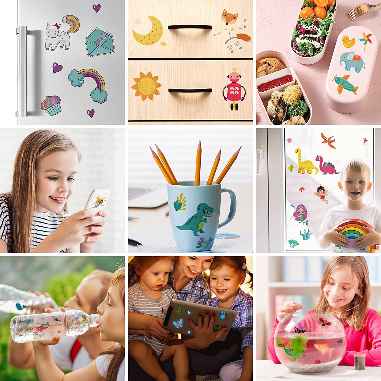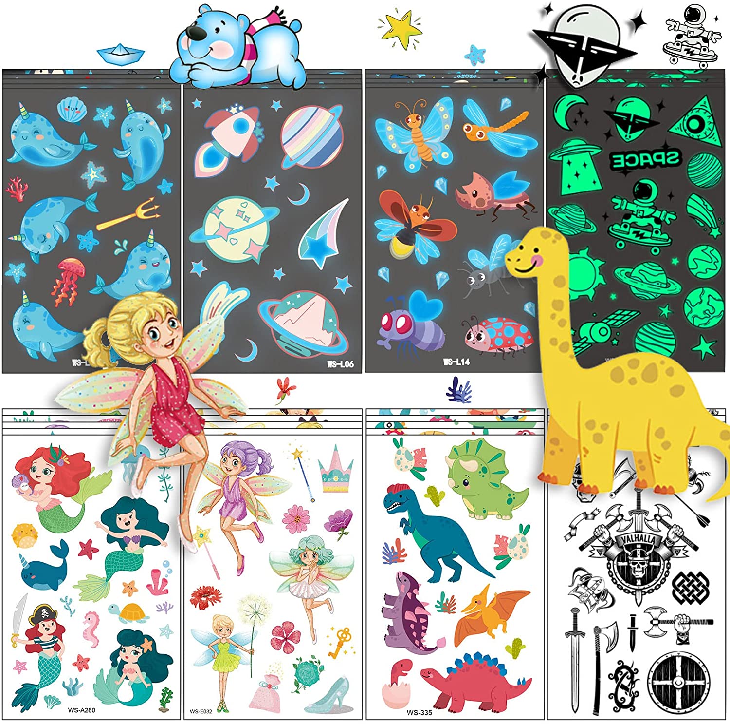 Tatuagens temporárias infantis - Kit de 40 folhas autocolantes de tatuagem UFO piratas golfinhos sereias, tatuagens de desenhos animados e tatuagens luminosas, para meninos e meninas