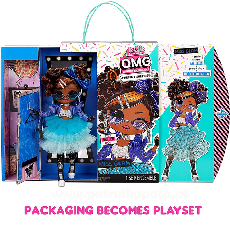 Descubra 20 surpresas – LOL Surprise OMG Present Surprise inclui 20 surpresas por descobrir, incluindo uma bela boneca da moda Miss Glam, com características de luxo e muitas roupas e acessórios. Vamos para a festa! - A Miss Glam está a organizar a festa de aniversário surpresa mais espetacular que existe e todos são convidados! Tem belos traços e um cabelo bem penteado, além de ser flexível para que possa fazer muitas poses. 5 visuais modernos: faça a Miss Glam usar seus fabulosos vestidos e acessórios e combine-os para criar 5 visuais diferentes. Dica: As mãos são removíveis para que possa vestir o seu pulso facilmente. Muita diversão - na caixa encontrará uma boneca da moda, roupa, sapatos, acessórios, um suporte para bonecas e muitas outras surpresas. O seu laço de cabelo azul é adorável!