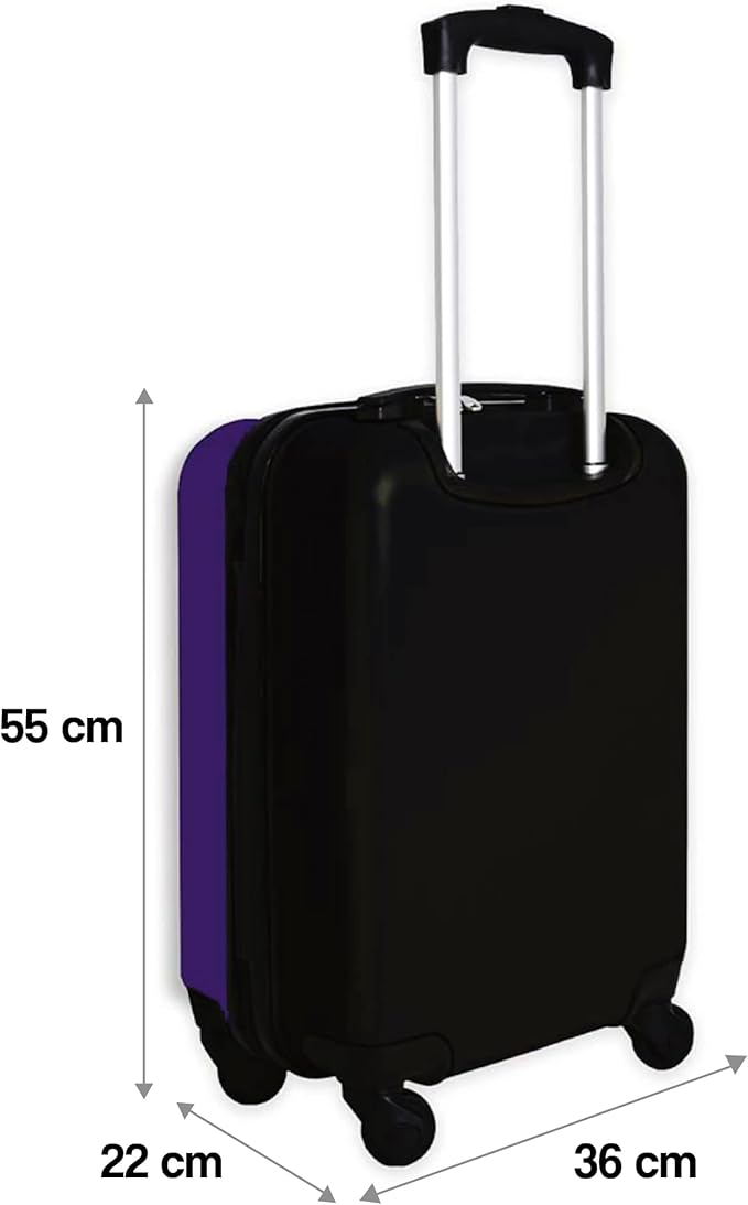 Tamanho: 55 x 36 x 22 cm. Mala de Cabine com 4 rodas giratórias e multidirecionais. Frente em filme PC impresso. Traseira em ABS. Rodas duplas personalizadas. Forro de nylon liso. Mala rígida muito resistente com alça extensível e fecho de correr feita no exterior com 95% ABS + 5% policarbonato e forro interior 100% Poliéster. Cumpre as medidas para malas de cabine estabelecidas pela Associação Internacional de Transporte Aéreo (IATA), o que o torna adequado para viagens de avião.